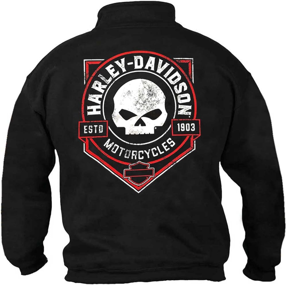 Harley-Davidson Men's Ragged 1/4-Zip Cadet Pullover Sweatshirt - Black, 40299684. With a zippered placket, this sweatshirt has all the appointments you want, the graphic details and the right cotton blend. Made of 60% cotton and 40% polyester, this pullover is a year round go-to garment for all your outdoor activities, on or off the bike. Awesome bold Harley-Davidson text with a distressed Willie G Skull logo graphic on back. Front features our Wisconsin Harley-Davidson Dealer logo. Rib-knit cuffs and bottom hem that will hold up ride after ride. Nothing says comfort quite like a cadet pullover & jeans. This sweatshirt has it all; comfort, quality and of course style! 40299684