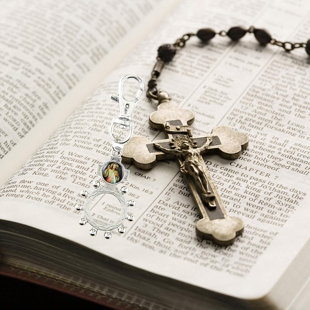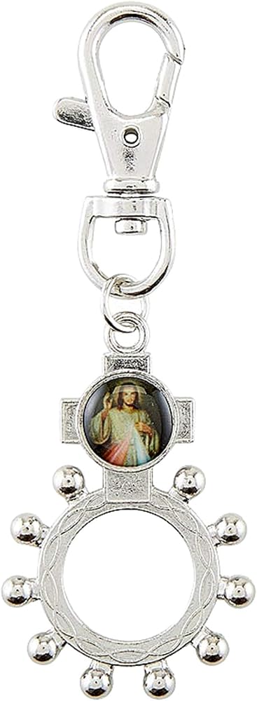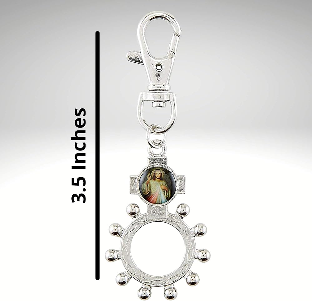 ROSARY RING is made of zinc allow and epoxy and is 3.5 inches long. HOW TO USE IT: Place finger in the opening at the center and put the thumb on the cross at the top. Recite the Our Father, then move the thumb onto the first small bead. Recite as many Hail Mary's as needed. KEYCHAIN features a lobster claw clip to easily hang on keychains, backpacks, lanyards, and more. CATHOLIC Divine Mercy will always be with you when you carry this key ring. KEEP CHRIST CLOSE to you at all times with this small rosary ring.