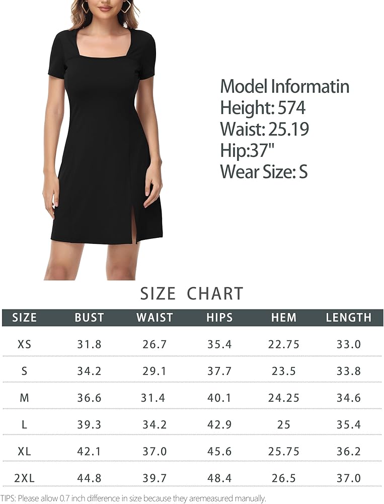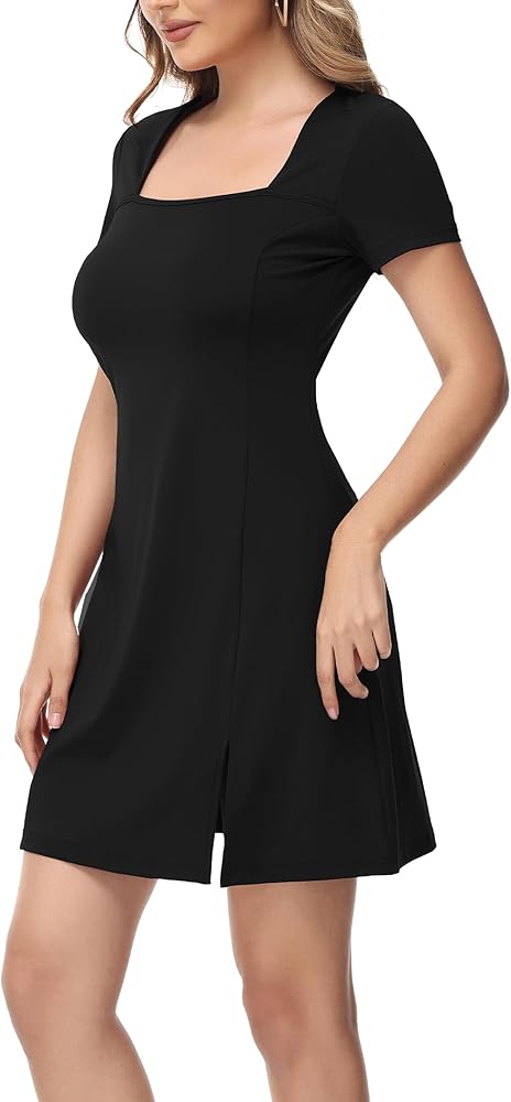 ZTN Women's Square Neck Bodice Casual Dress Short Sleeve Stretch Flare Mini Dresses(No Built in Shorts).