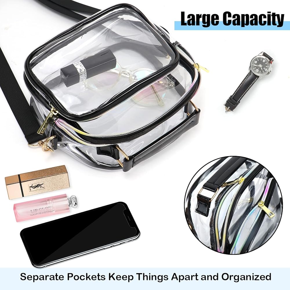【حقيبة كروس شفافة ذات سعة كبيرة】- قياس 17.78 سم ارتفاع × 19.05 سم عرض، كبيرة بما يكفي لوضع هاتفك، والنظارات الشمسية، والمحفظة، والواقي من الشمس؛ مع جيب أمامي إضافي، يسهل حمل الأشياء الصغيرة مثل المفاتيح والبطاقة المصرفية والنقود وسماعات الأذن.