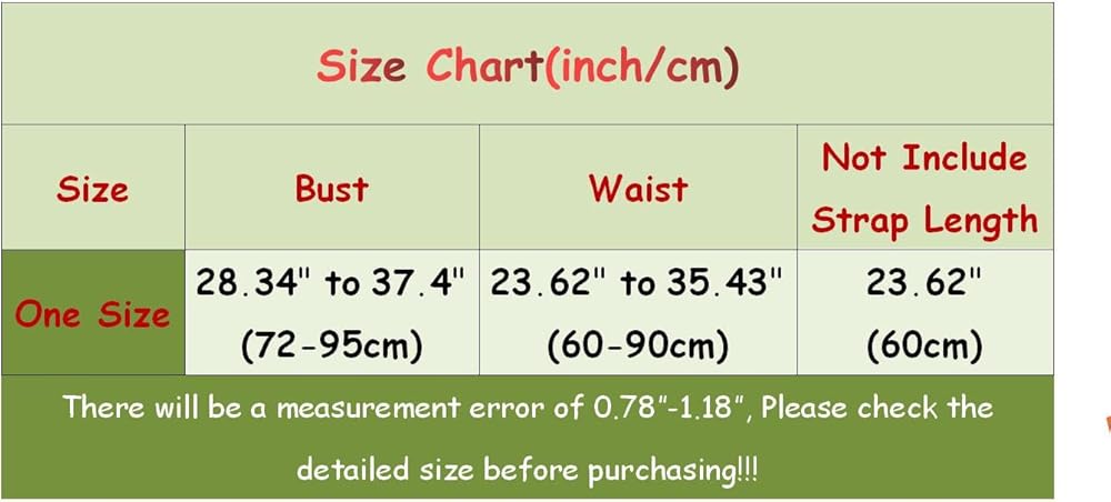 One Size : Bust 28.34" to 37.4"(72-95cm) , Waist 23.62" to 35.43"(60-90cm) , Not Include Strap Length 23.62"(60cm).