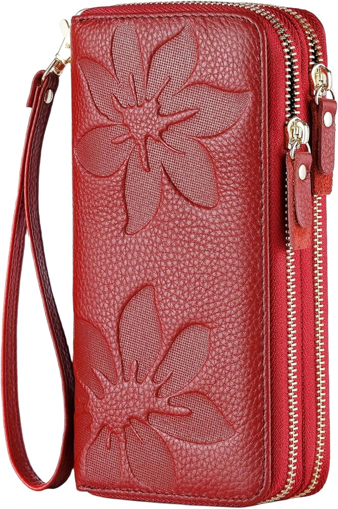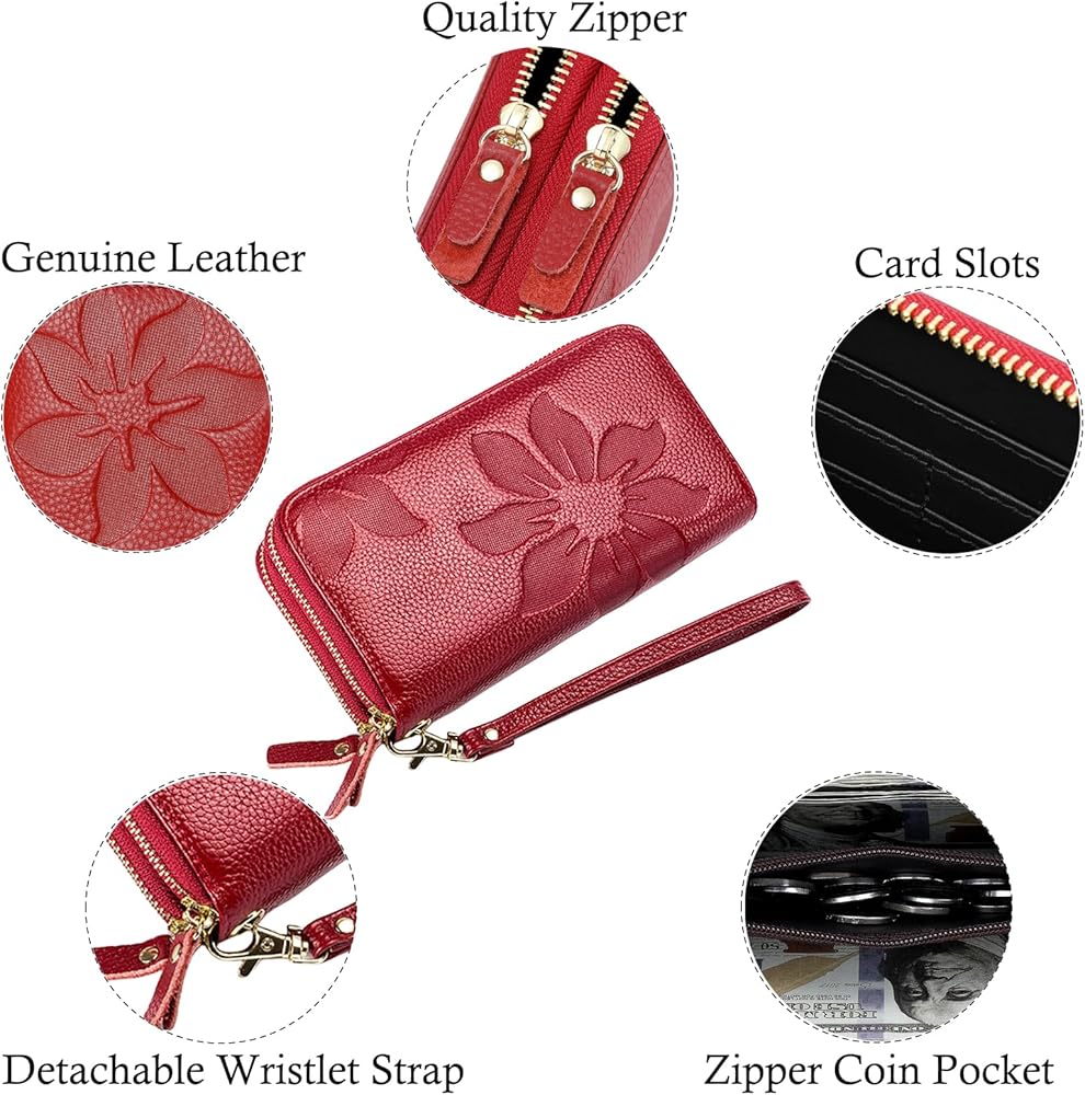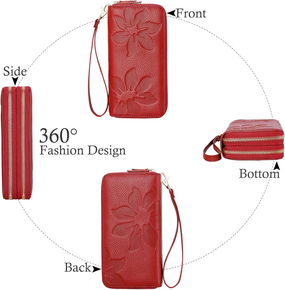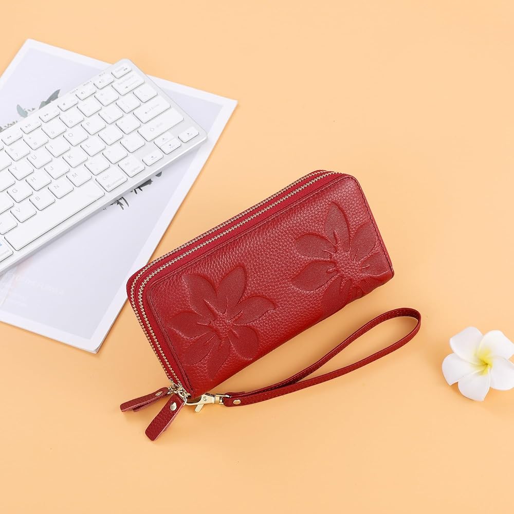 • 【خامة عالية الجودة وتصميم زهور】هذه المحفظة النسائية مصنوعة من جلد أصلي عالي الجودة مع سحابات ناعمة وحزام معصم مريح. يتميز بنمط زهرة منقوش بسيط ولكنه جميل يمنحه ملمسًا وأسلوبًا جميلاً للغاية. مظهر جيد، أداء عالي التكلفة، مقاوم للاهتراء ومتين.