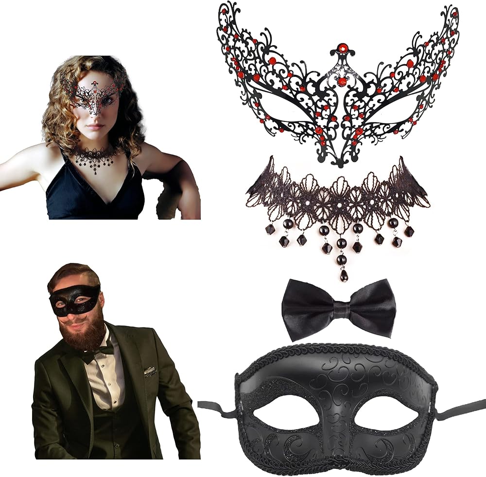 • 🍻[PACKAGE INCLUDES]: 1 pcs men's Mask, 1 pcs women's Mask, 1 pcs Bow tie, 1 pcs women's choker. Note: These masks are more suitable for thin face. Men's masks are also suitable for slim men and women.