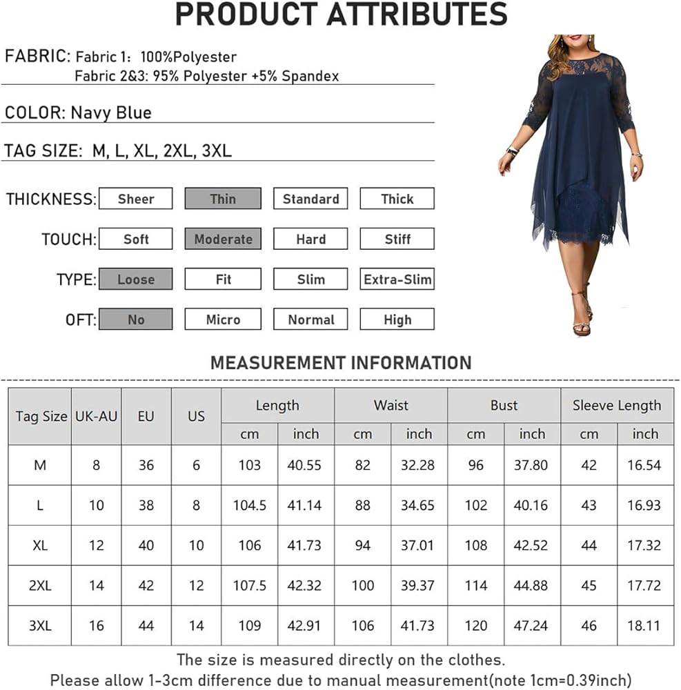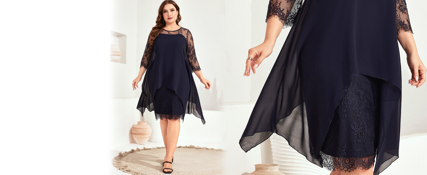 فستان شيفون دانتيل رائع للمقاسات الكبيرة. ضعه في كيس الغسيل لغسله بدرجة حرارة منخفضة وقم بكيه بعناية على درجة حرارة منخفضة.