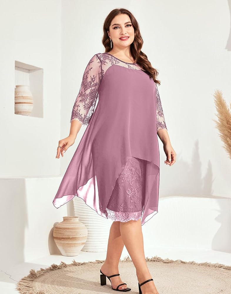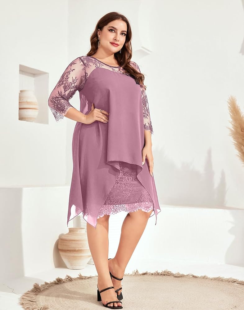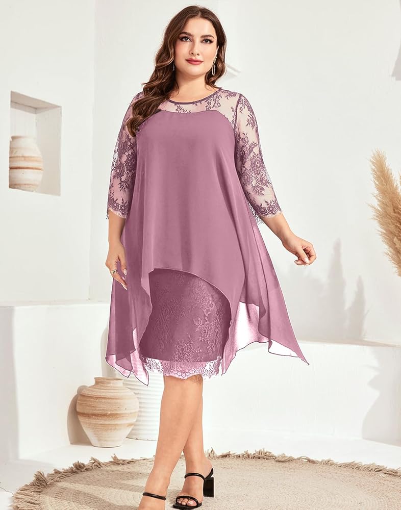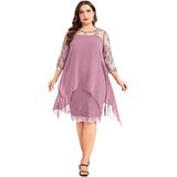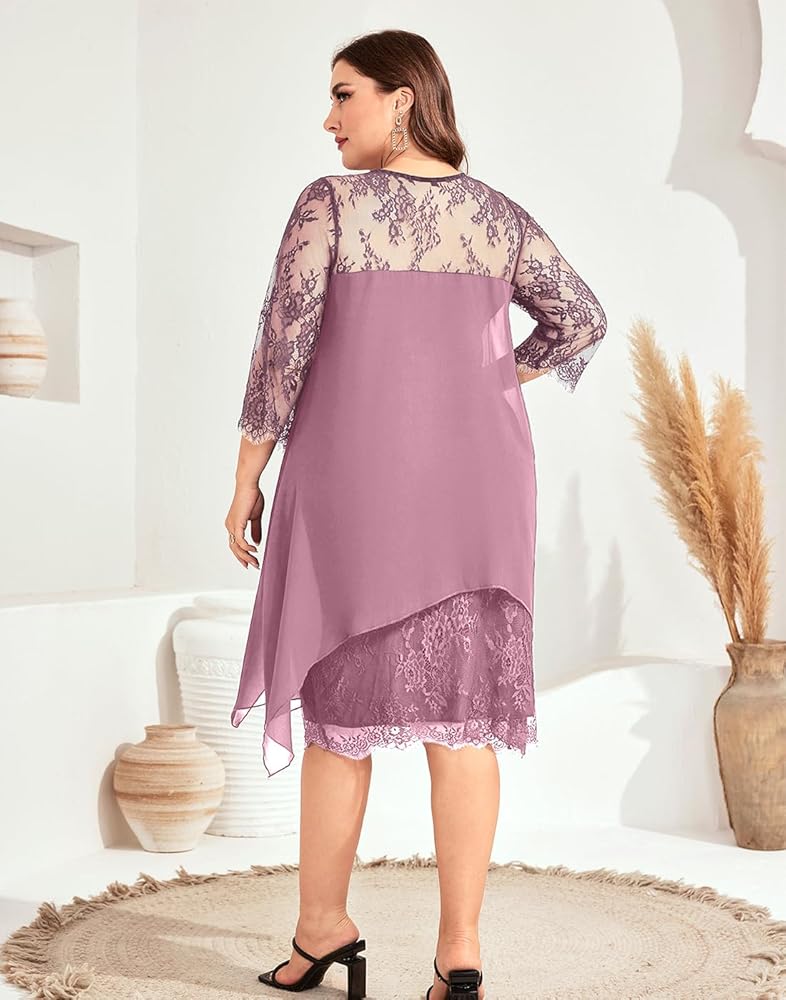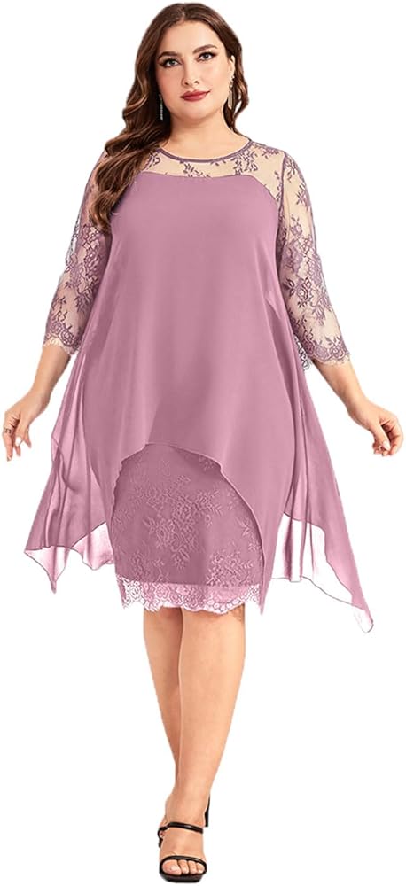 فستان رسمي بمقاس كبير مع أكمام طويلة من الدانتيل العتيق 3/4، طبقتين مع جسم من الدانتيل الزهري وطبقة خارجية من الشيفون المتدفق، سهل إخفاء البطن. فساتين ميدي بطول الركبة للمنحنيات.
