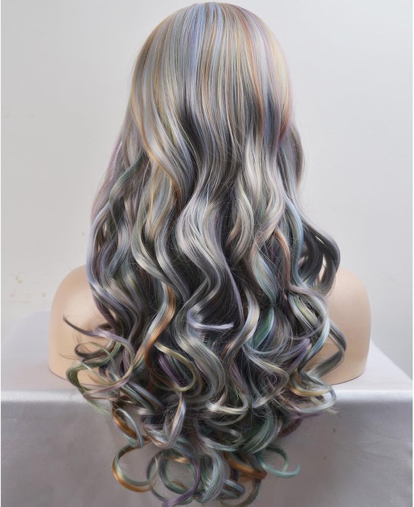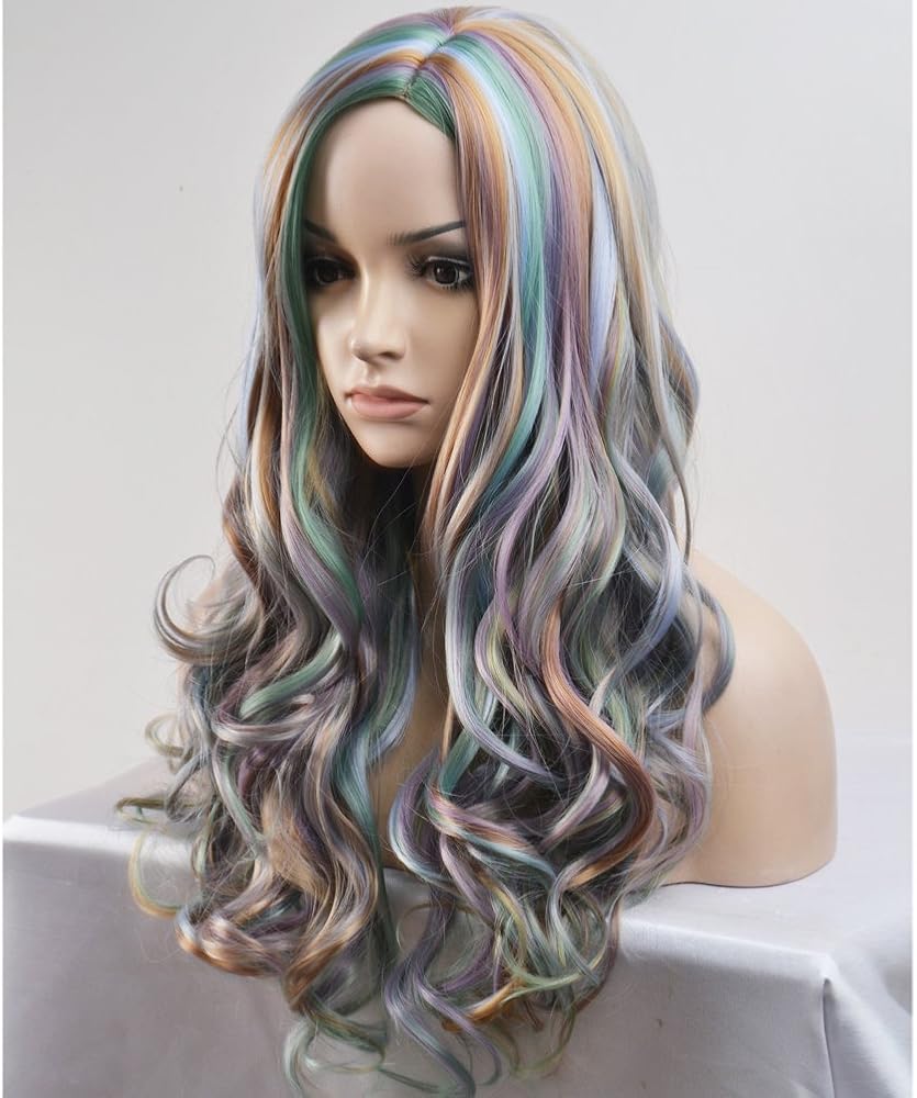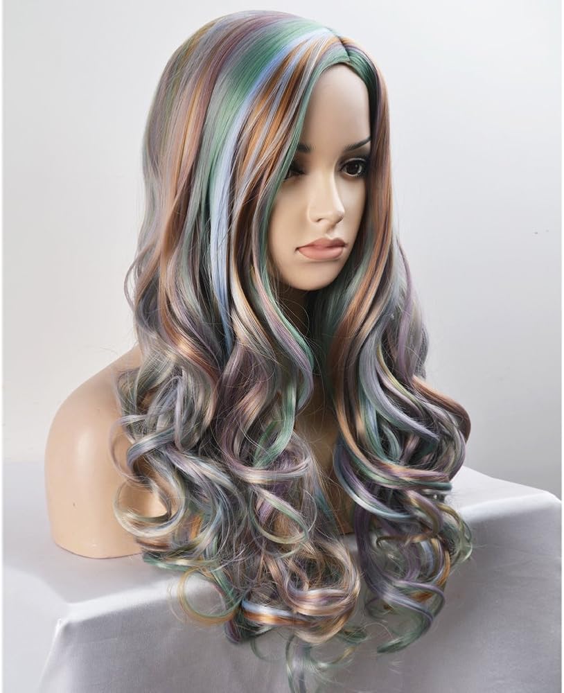 شعر مستعار طويل مجعد ملون بطول 68.58 سم، شعر مستعار كامل ساحر للنساء والفتيات للحفلات التنكرية بلون الباستيل مع قبعة شعر مستعار (رمادي/أخضر/بني/أزرق) من بيرون