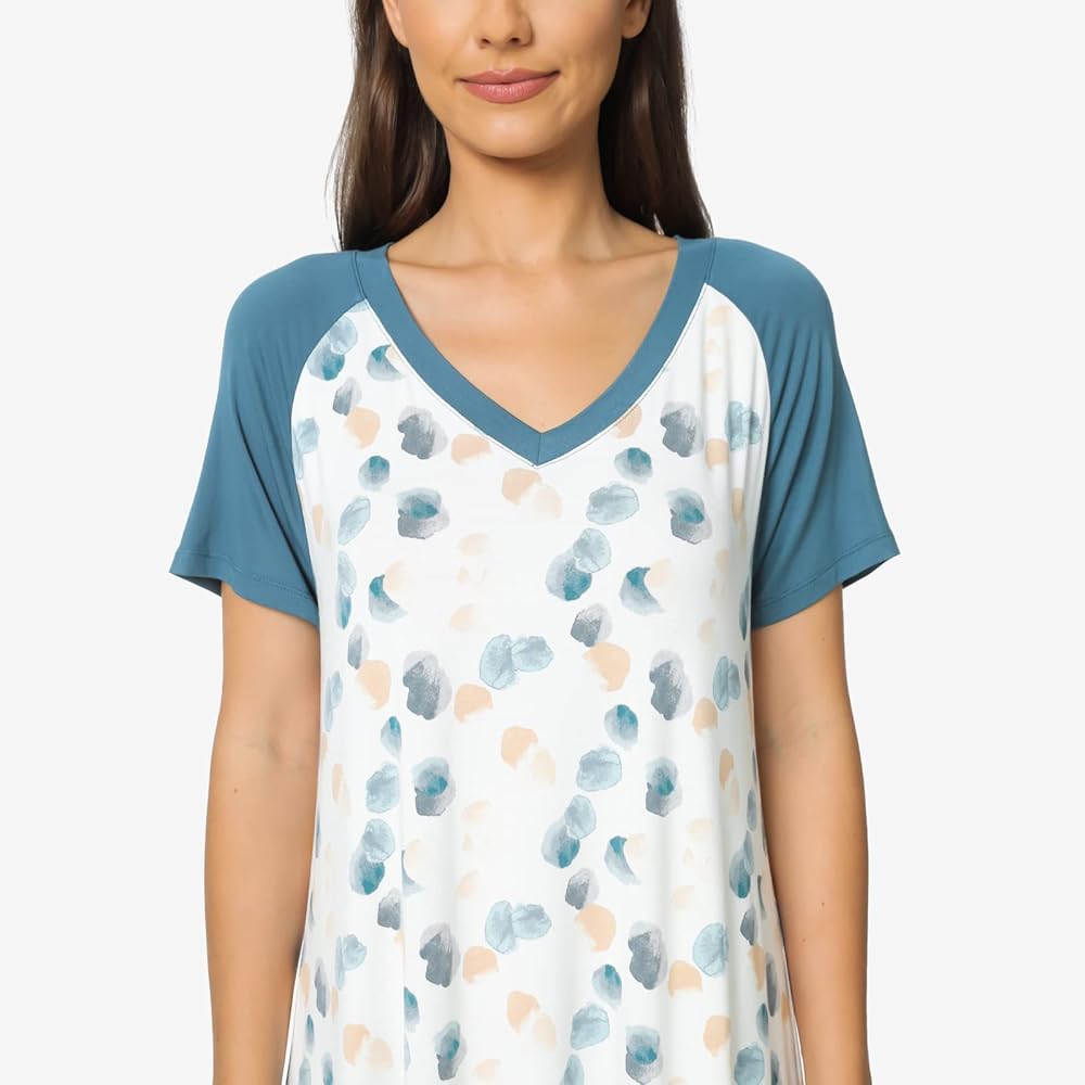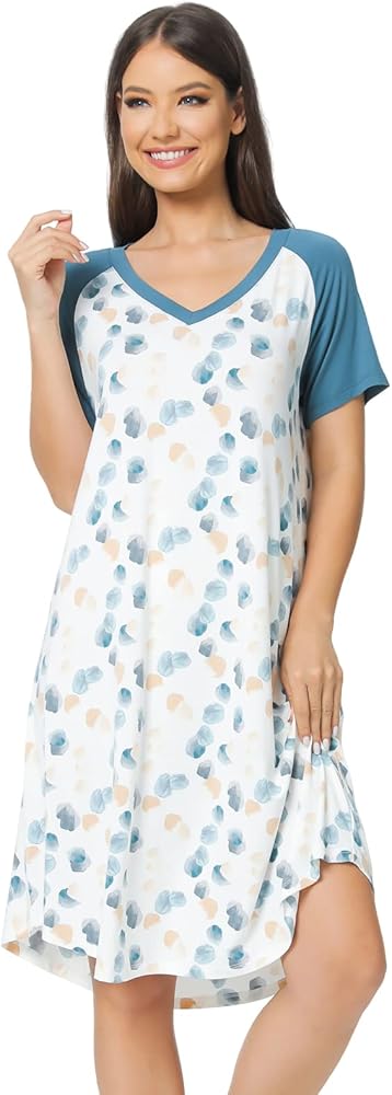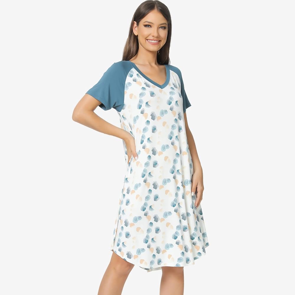 تصميم كاجوال: رقبة على شكل حرف V، حاشية منحنية انسيابية، مطبوعات رائعة، الطول أسفل الركبة. تصميم البلوفر البسيط والمرونة الغنية يجعل ثوب النوم ذو الأكمام القصيرة سهل الارتداء، ويمد ساقيك وذراعيك بحرية دون أي قيود.