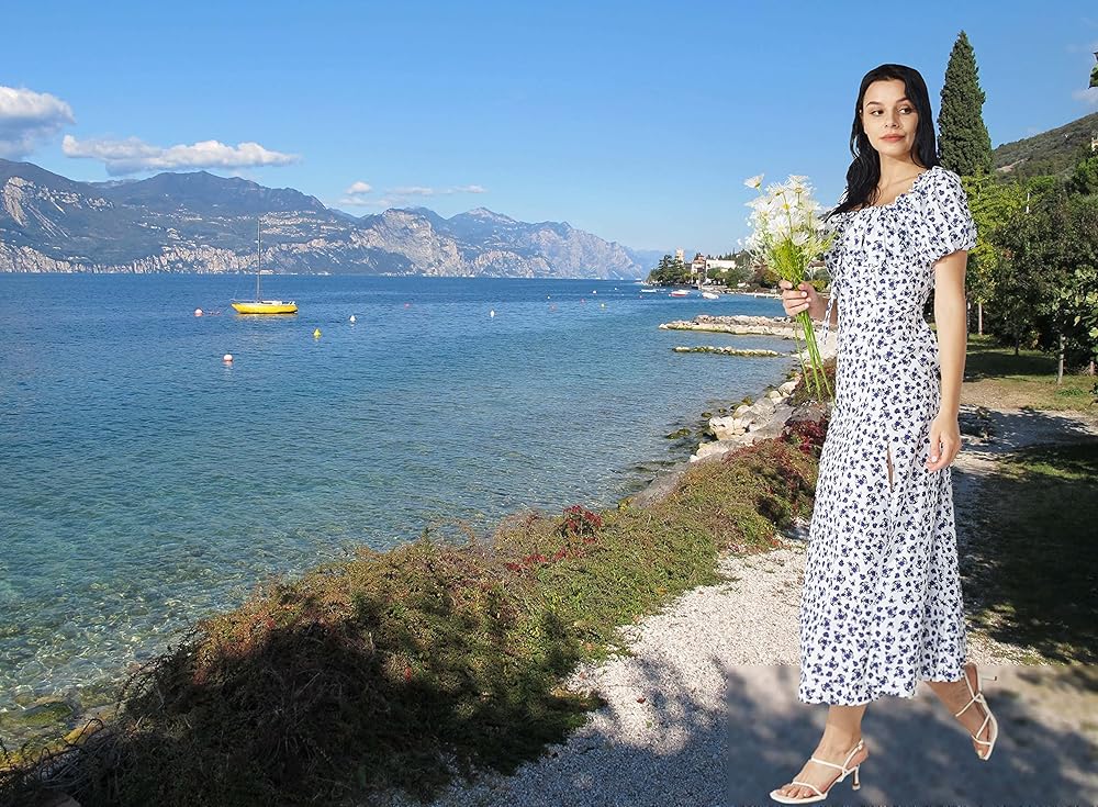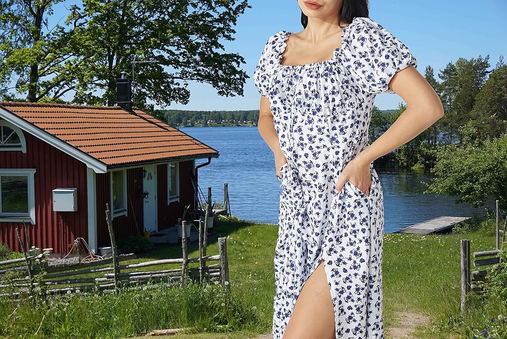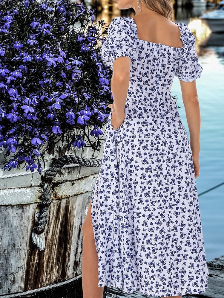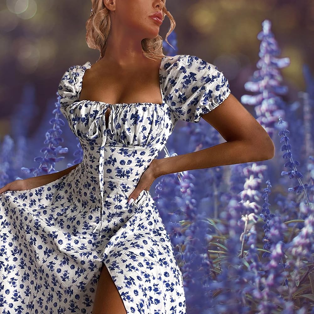 ✔فستان طويل مع صدر مكشكش وأكمام منتفخة، تصميم عصري: فستان بوهو قطني عتيق مكشكش بفتحة رقبة مربعة وطباعة زهور، تصميم بأكمام قصيرة منتفخة جميلة، فستان صيفي Cottagecore للنساء والفتيات المراهقات، اختيار جيد للشاطئ الصيفي، وحفلات أعياد الميلاد ، كاجوال، ملابس يومية، مكتب، تجعلك جذابة
