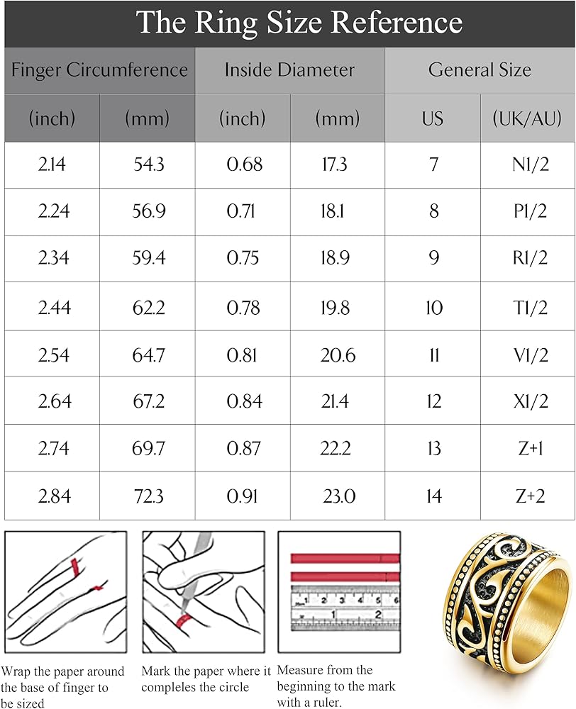 • 【حجم الخاتم القياسي】العرض: حلقة سيجنيت سلتيك 0.57 بوصة، حلقة عريضة الإبهام 0.67 بوصة، حلقة دوارة للسلسلة الكوبية 0.3 بوصة، حلقة منقوشة بالمفتاح اليوناني 0.3 بوصة. مقاس 7-13 متوفر، مناسبة لمعظم أصابع الجنسين .قبل اختيار مقاس الخاتم، يرجى قياس إصبعك بالطريقة الصحيحة لتوفير وقتك. يمكنك الرجوع إلى الرسم البياني المرجعي للمقاس الأخير لاختيار مقاس الخاتم.