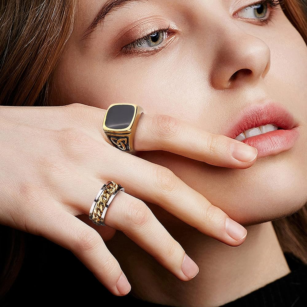 • 【حلقة من الفولاذ المقاوم للصدأ 】مجموعة خواتم Signet الرجعية هذه مصنوعة من الفولاذ المقاوم للصدأ، قوية ومتينة، ليس من السهل أن تبهت، عملية طلاء كهربائي متقدمة، فترة احتفاظ طويلة بالألوان، تسلط الضوء على الملمس وتظهر ذوقك العالي عند الارتداء. سطح داخلي أملس، مريح جدًا ليرتدي.