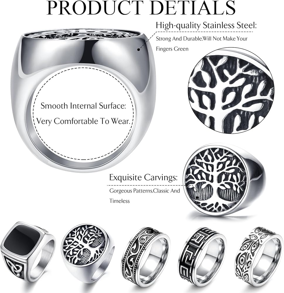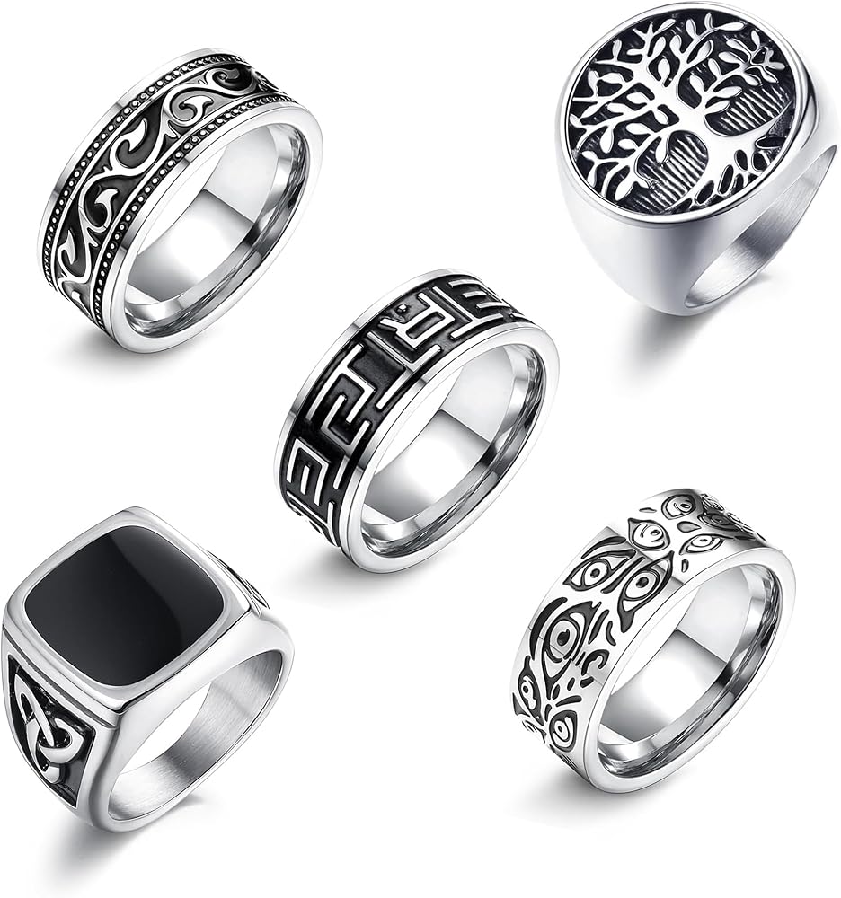 【مجموعة خواتم Signet】تتضمن العبوة 5 قطع من حلقات راكبي الدراجات النارية من الفولاذ المقاوم للصدأ، بما في ذلك حلقات Signet وحلقات شريط سلتيك، حلقات عتيقة للرجال من أنماط مختلفة، حلقات منحوتة رائعة، حلقات أنماط رائعة، حلقات على الطراز القديم، حلقات على الطراز اليوناني، تباين جريء من الأسود والفضي، الكلاسيكي والخالد، عمليات طلاء وتلميع متعددة لخلق لمعان مزخرف. امتلك مجموعة الخواتم الرجالية هذه، أظهر ذوقك في مناسبات مختلفة.