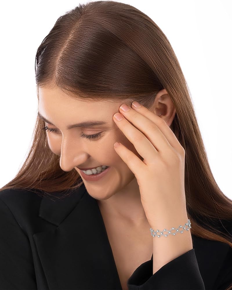 • AAA + أحجار الزركون قاعدة من الفضة الإسترلينية المميزة BIS الطول 6.6 سم آلية انتقال مبتكرة لتناسب جميع أحجام المعصم والأصابع مطلية إلكترونيًا مضادة للتشوه (مع الروديوم) لمنع تشويه الفضة