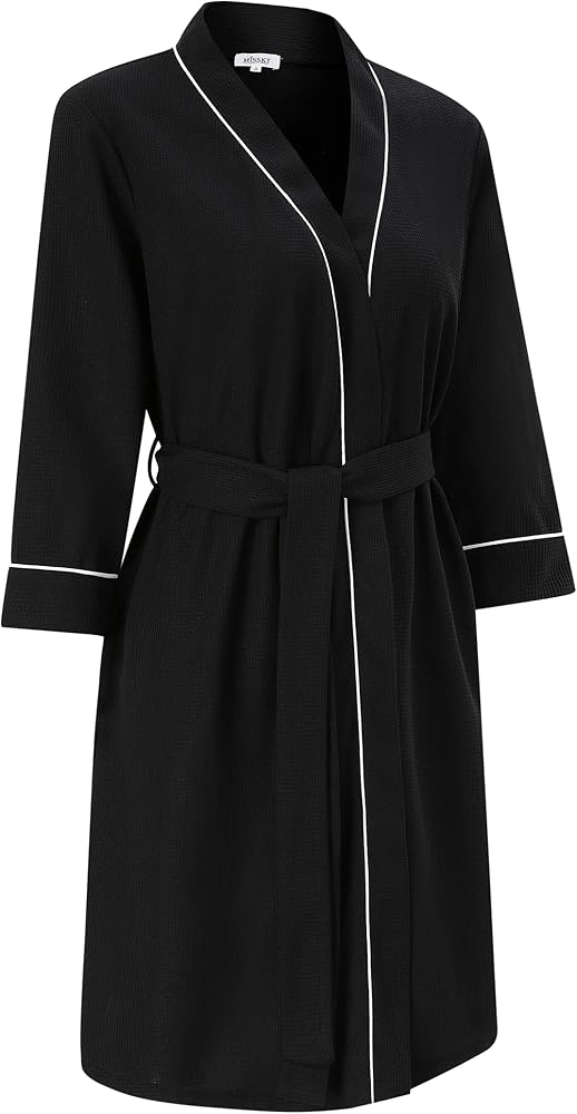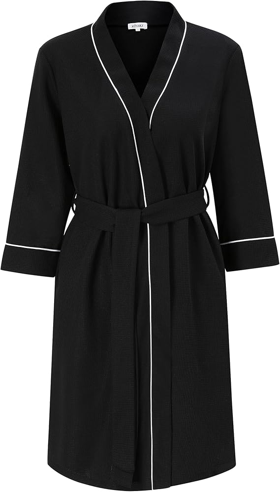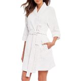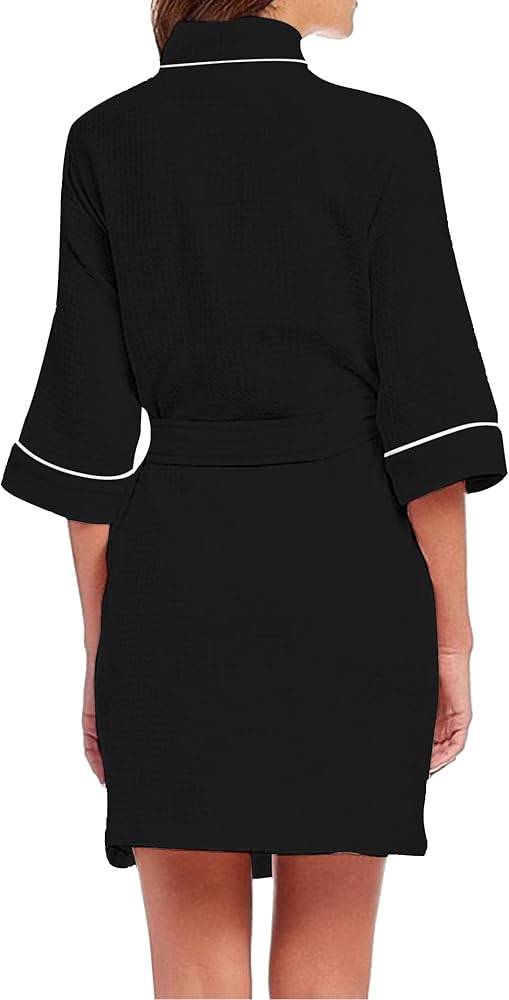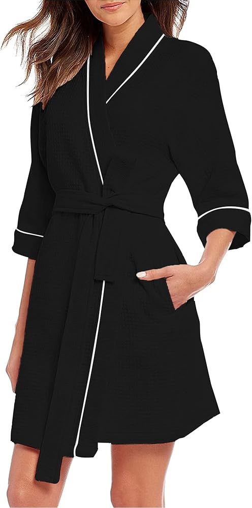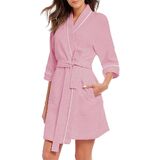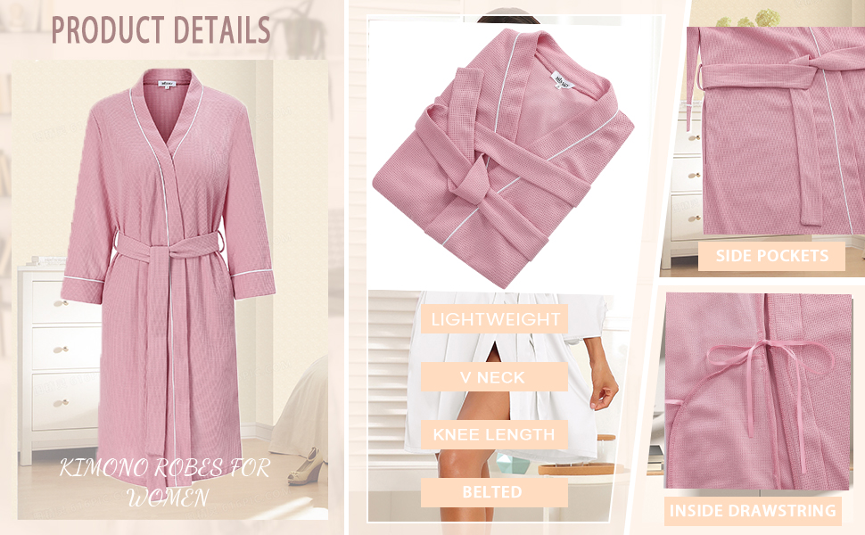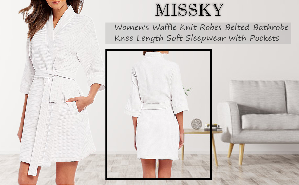 - المزايا: ياقة شال/ رقبة على شكل حرف V/ حزام/ جيبان جانبيان/ نسيج وافل/ طول الركبة/ رقعة مخططة بيضاء. رداء حمام نسائي فضفاض.
