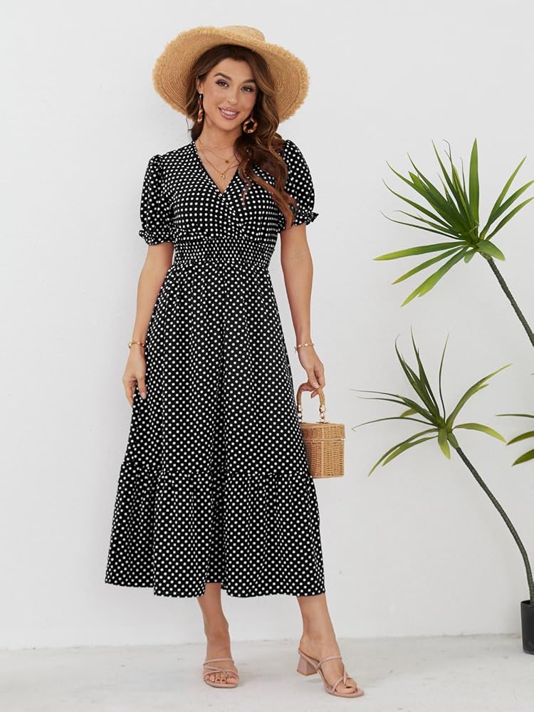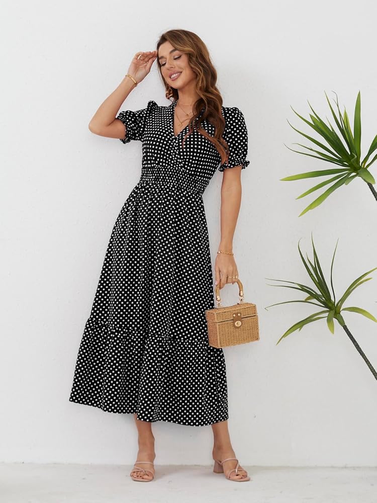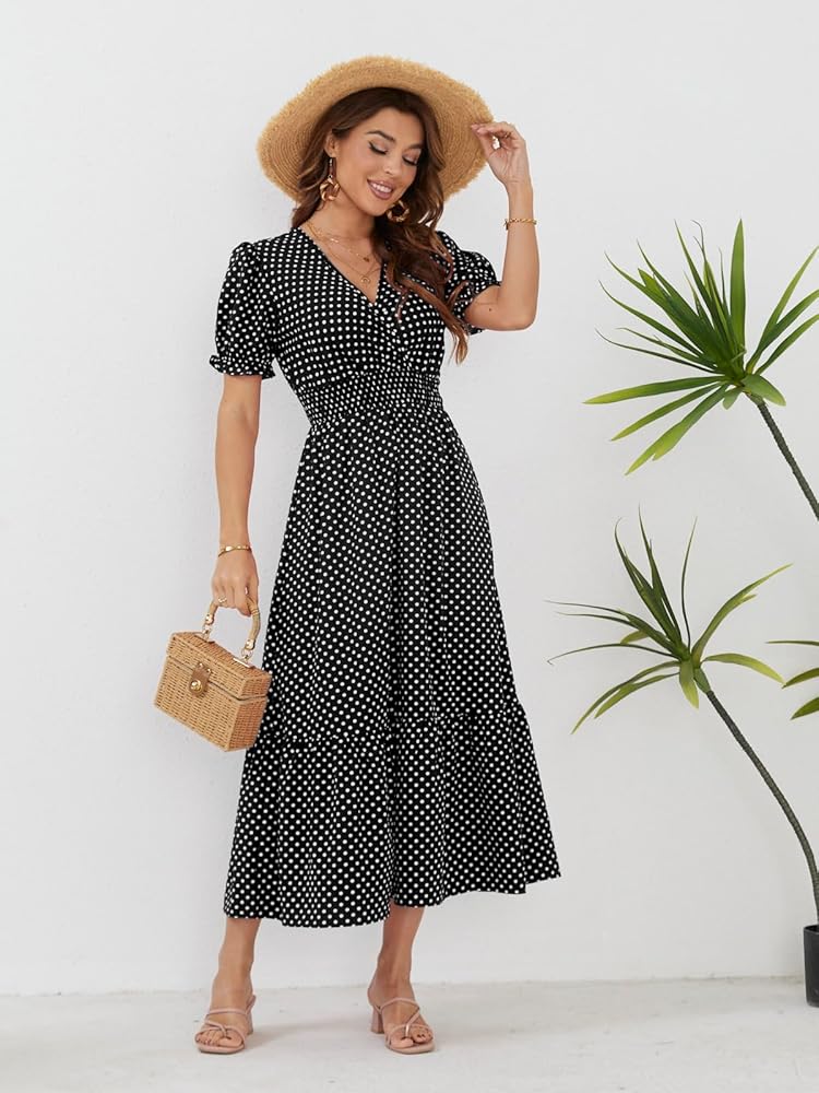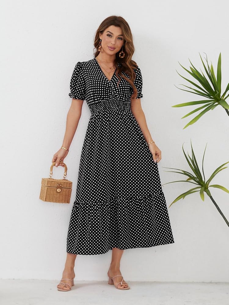 النمط: مظهر أنيق دون عناء مع فستاننا ذو الرقبة على شكل حرف V والأكمام القصيرة والمفصل بأنماط منقطة، وحاشية مكشكشة، وخصر عالي مرن يخلق مقاسًا جذابًا على شكل حرف A. يمكن أن يُظهر نمط الرقبة المثير على شكل حرف V خط رقبتك الجميل وخصرك العالي المرن يمكنه إخفاء بطنك جيدًا. الفستان المثالي لأي مناسبة!
