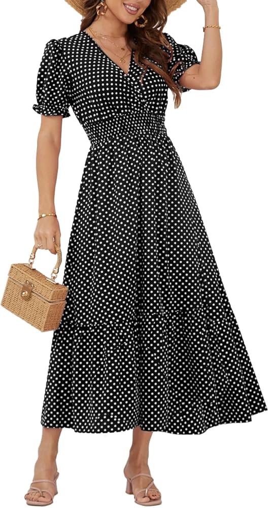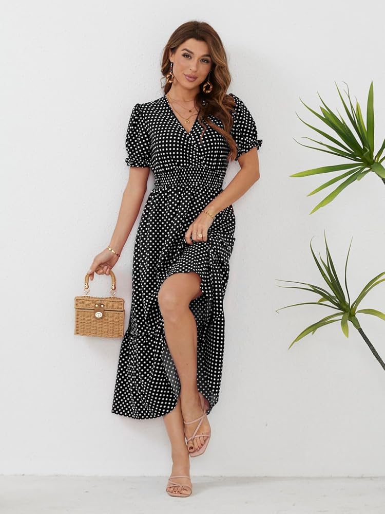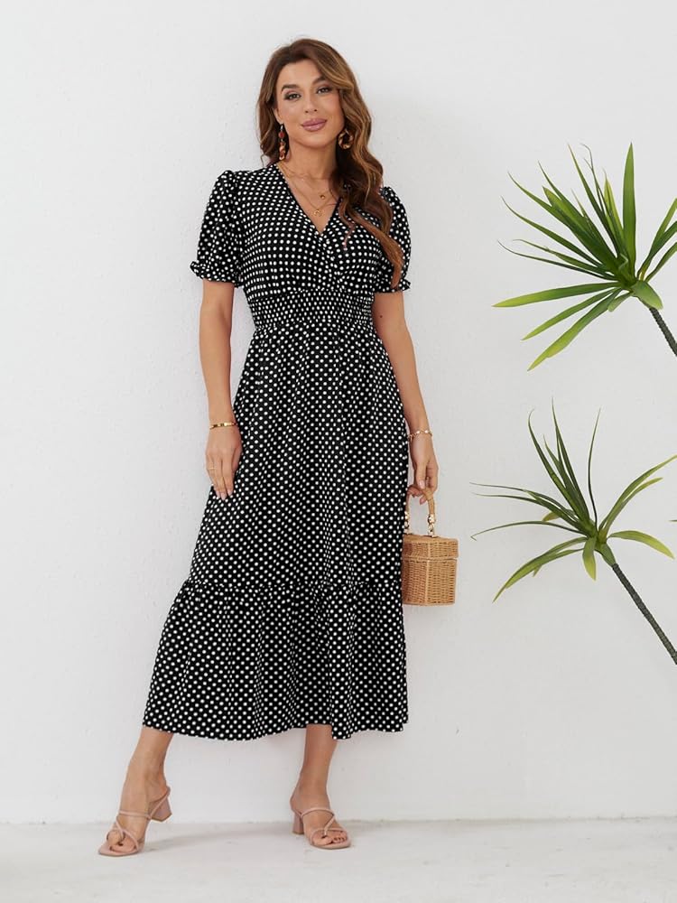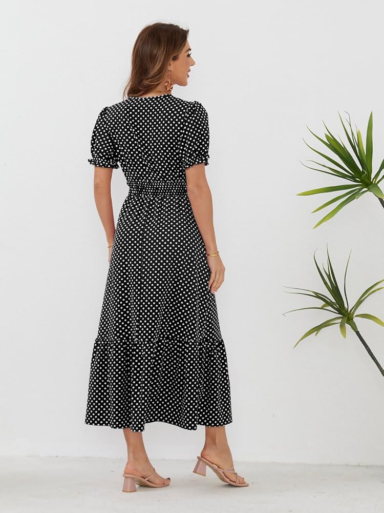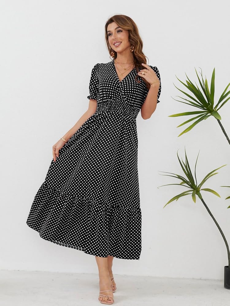 النمط: مظهر أنيق دون عناء مع فستاننا ذو الرقبة على شكل حرف V والأكمام القصيرة والمفصل بأنماط منقطة، وحاشية مكشكشة، وخصر عالي مرن يخلق مقاسًا جذابًا على شكل حرف A. يمكن أن يُظهر نمط الرقبة المثير على شكل حرف V خط رقبتك الجميل وخصرك العالي المرن يمكنه إخفاء بطنك جيدًا. الفستان المثالي لأي مناسبة!