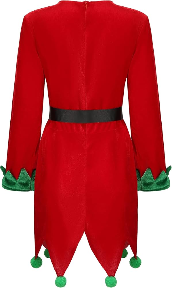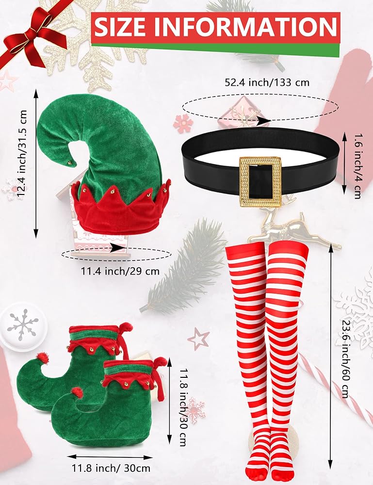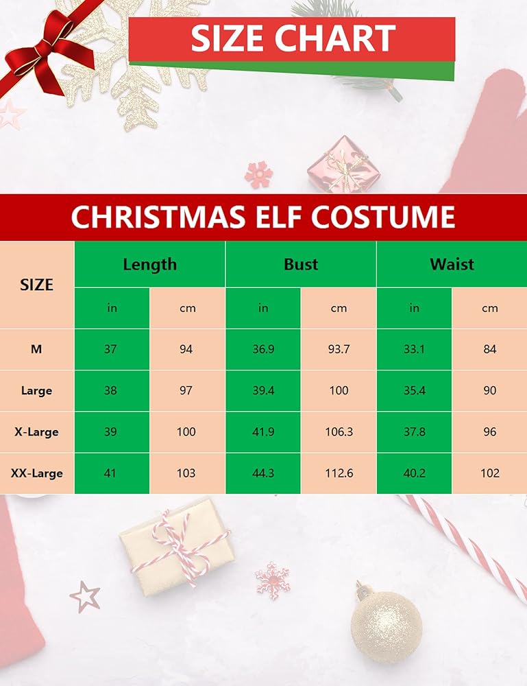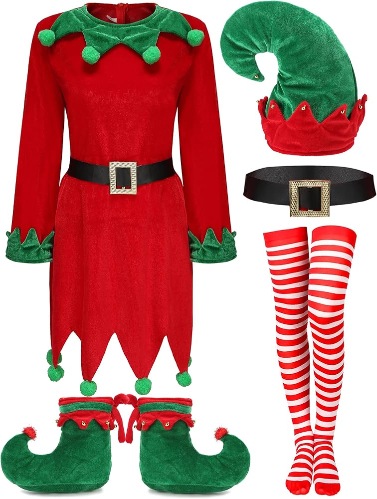 • Women Elf Costume Includes: 1 x Elf Costume, 1 x Elf Hat, 1 x Elf Shoes, 1 x Belt, 1 x Striped Stockings, includes all for you to dress up as an elf