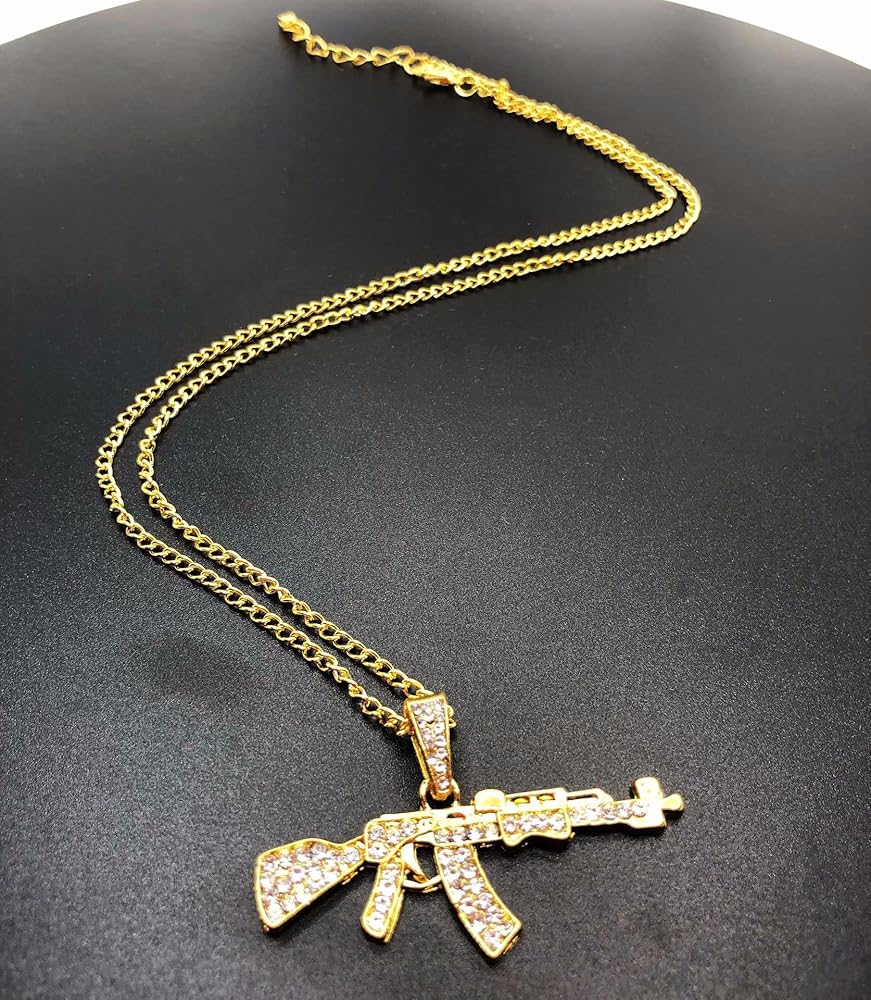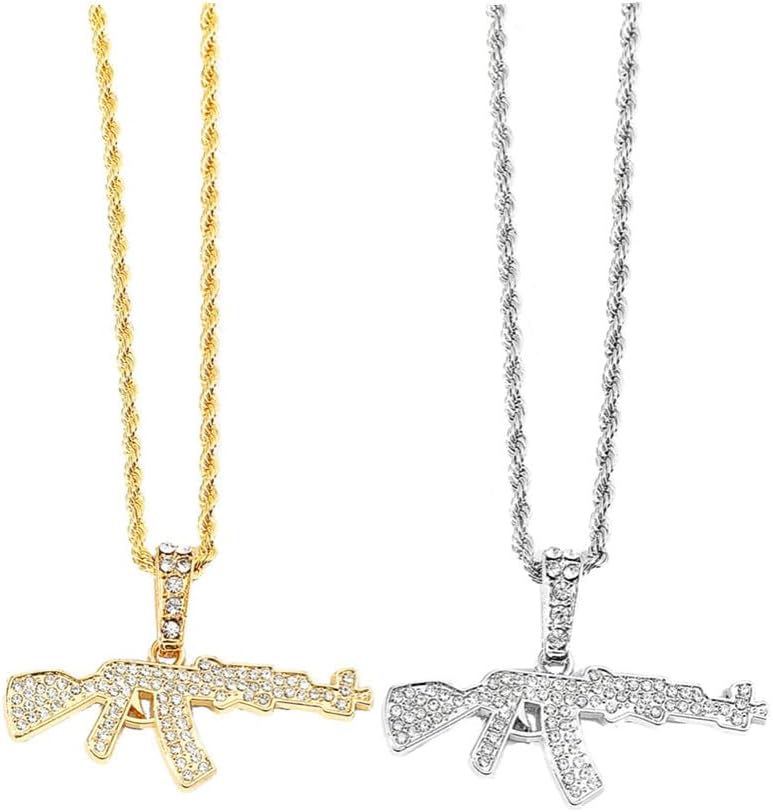اكس سي اف اس مجموعة واحدة من قطعتين من تيتانيوم ستيل حفر كامل من الزركونيا المكعبة بدلاية على شكل مسدس رشاش مطلي بالفضة والذهب، قلادات معدنية مرصعة بالزركونيا المكعبة