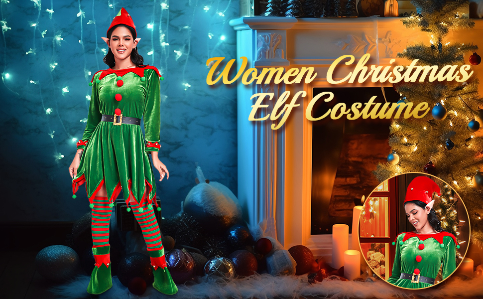 فستان Elf النسائي: هذا الفستان مصنوع من المخمل فائق النعومة، مع اللون الأحمر والأخضر لعيد الميلاد الكلاسيكي لخلق جو احتفالي. توجد زخارف جرس حول خط عنق الملابس، وزخارف كروية على الحاشية مصنوعة يدويًا.