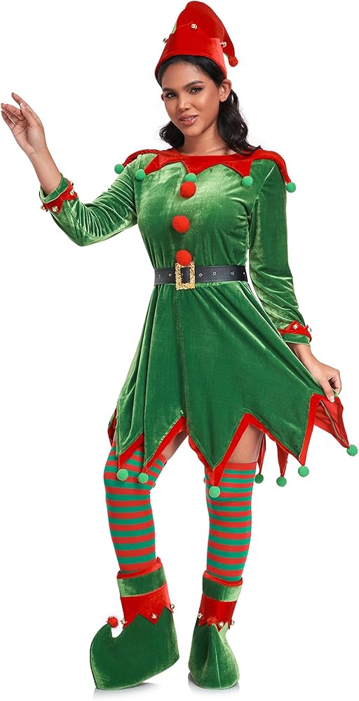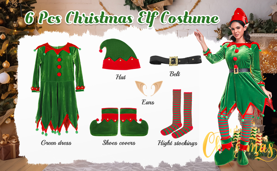 6 قطع أزياء قزم عيد الميلاد النسائية تتضمن: فساتين مخملية خضراء قزم، قبعة قزم خضراء، زوج واحد من آذان قزم، حزام جلد صناعي أسود، زوج واحد من الجوارب العالية المخططة باللونين الأخضر والأحمر، زوج واحد من أحذية قزم مع جرس.