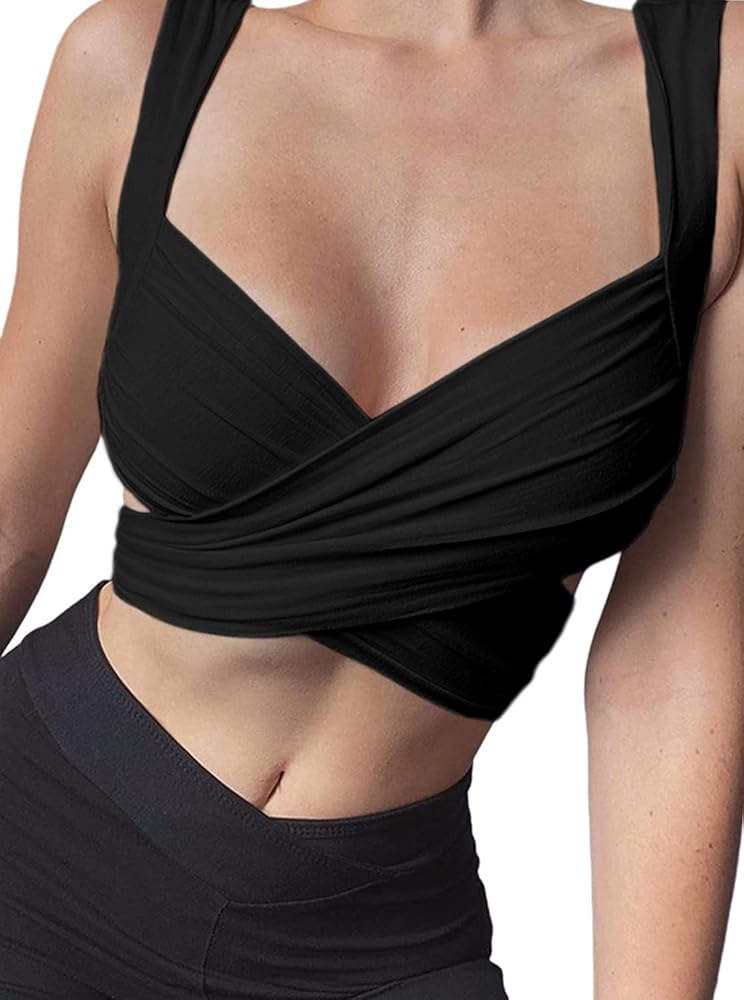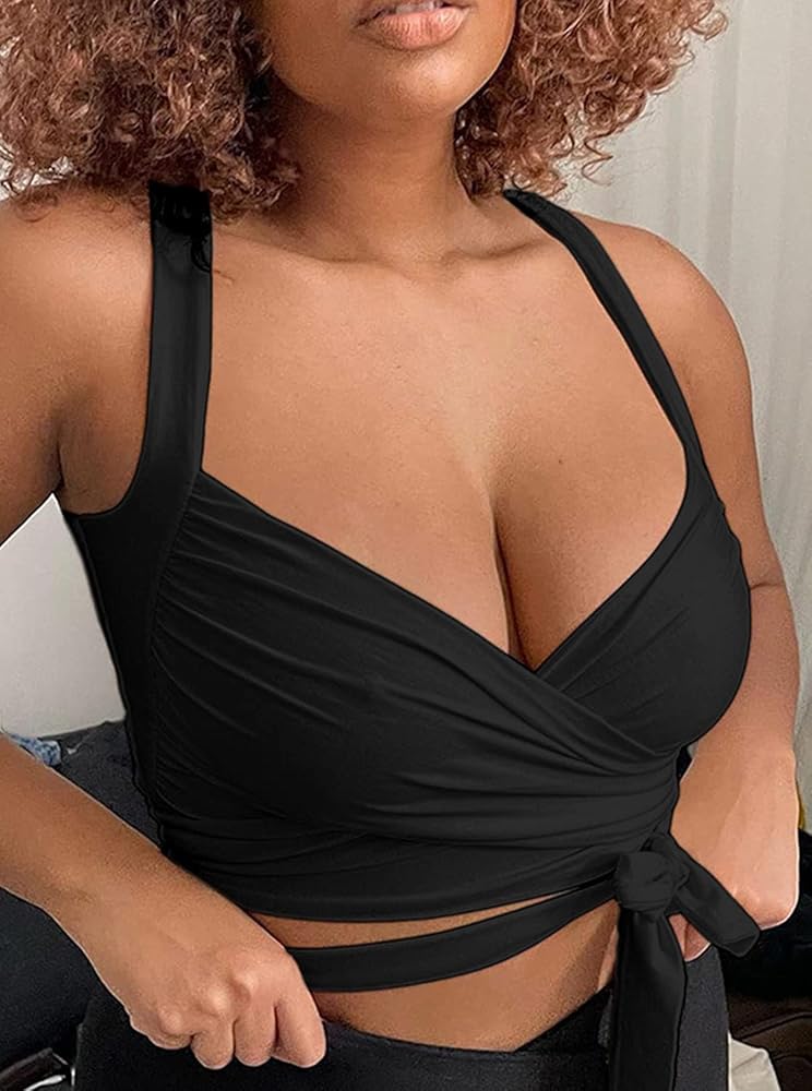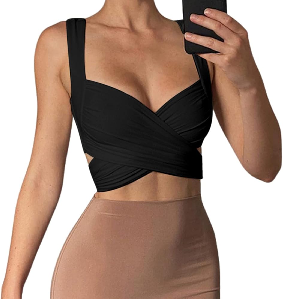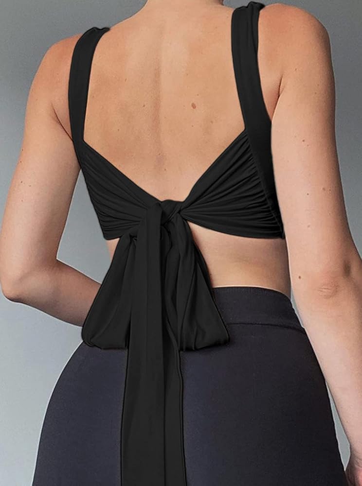 Women's Tie Front Shirred Crop Top Backless Casual Tank Top Blouse