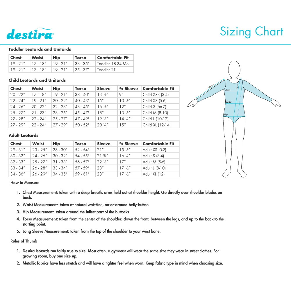 ملاءمة مثالية: ارجع إلى جدول مقاسات Destira للحصول على المقاس المثالي وعندما تكون في شك - قم بالمقاس الأكبر! نحن نتناسب مع مقاس ملابس لاعبة الجمباز الخاصة بك، لذا إذا كانت ترتدي ملابس طفل كبير (12) في الملابس، فسوف ترتدي نفس الشيء في ديستيرا.