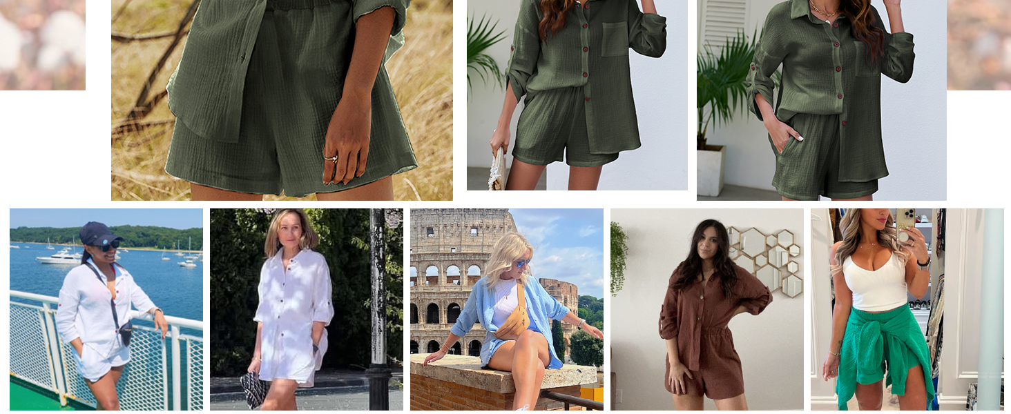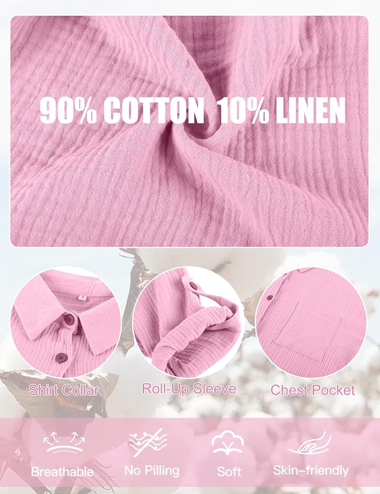 • الخامة: طقم الكتان النسائي المكون من قطعتين مصنوع من قماش قطني خفيف وناعم وكتان أقل مرونة، مما يجعله أكثر مقاومة للاهتراء وأقل عرضة للتجعد من مواد الكتان الأخرى. كما أنه جيد التهوية ولطيف على البشرة، مما يوفر أقصى قدر من الراحة خلال الصيف الحار.