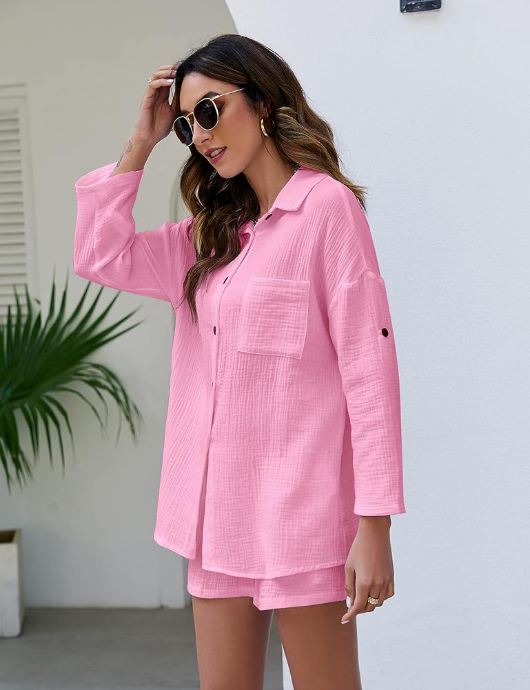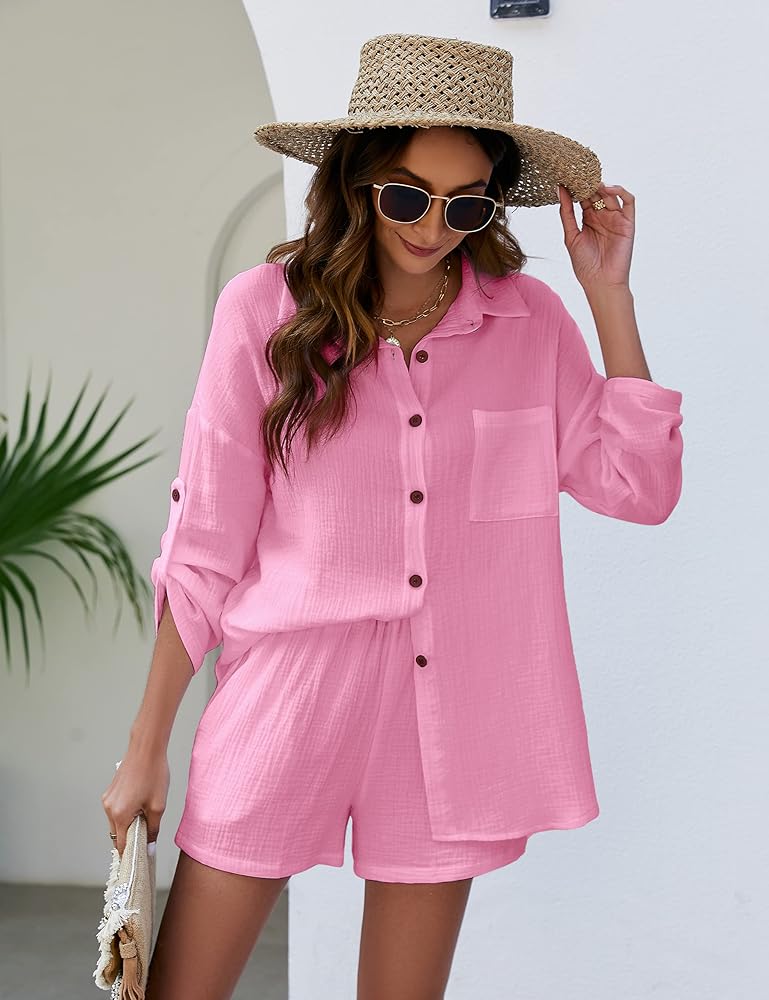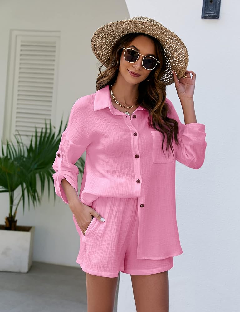 بيهايم طقم ملابس استرخاء للنساء من القطن والكتان مكون من قطعتين قميص بأزرار سفلية وشورت كاجوال فضفاض
