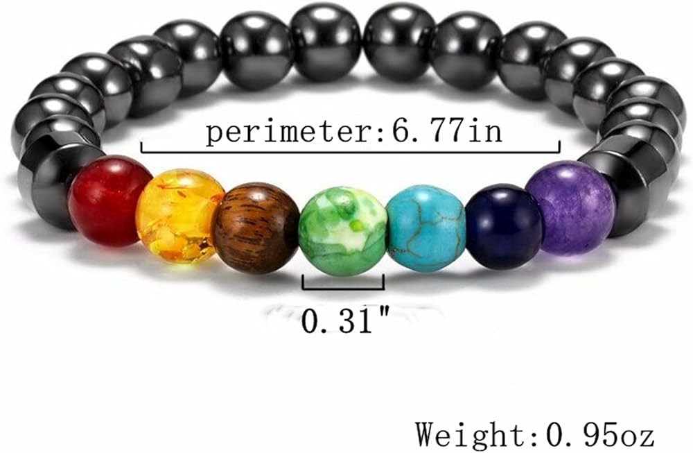 1. المقاس: يبلغ قطر كل حجر لافا وخرزة شاكرا 0.31 بوصة. الطول الداخلي للسوار 6.77 بوصة وهو مرن، ويناسب معظم النساء والرجال.