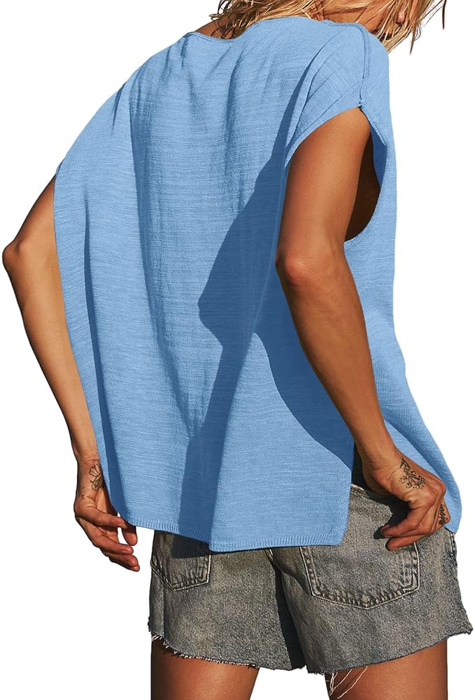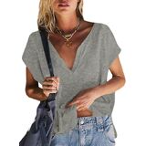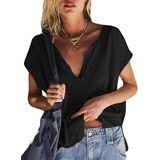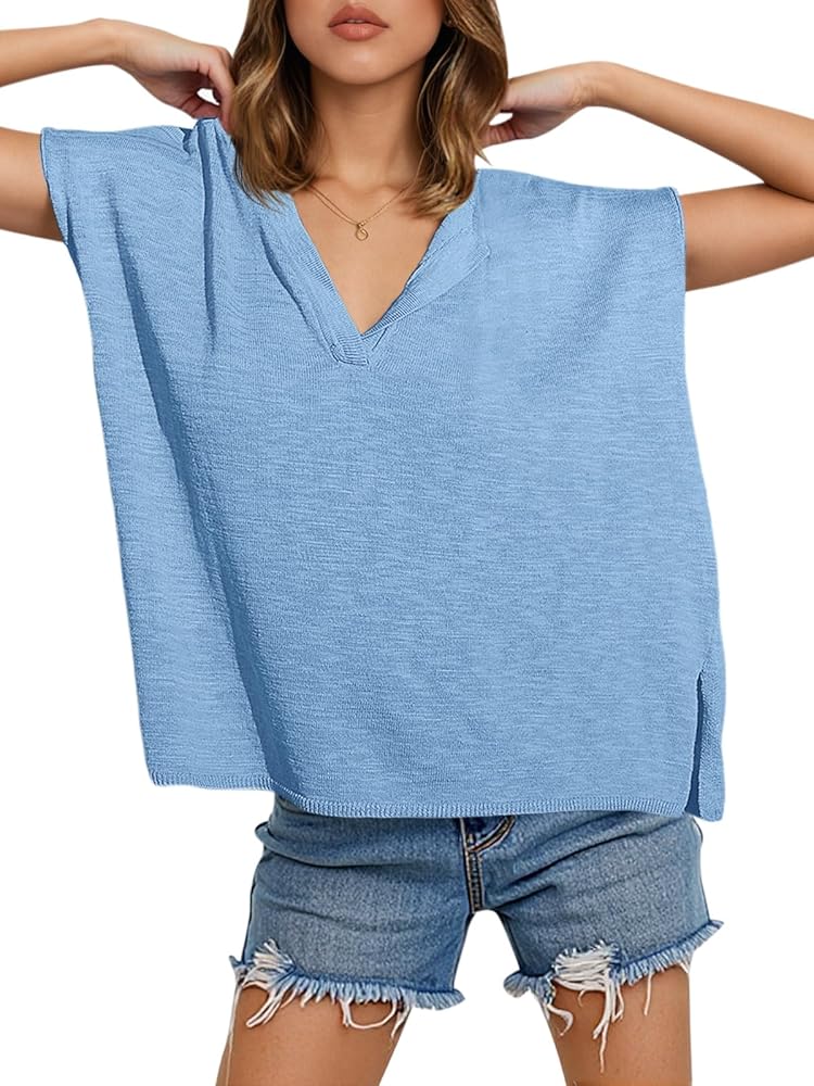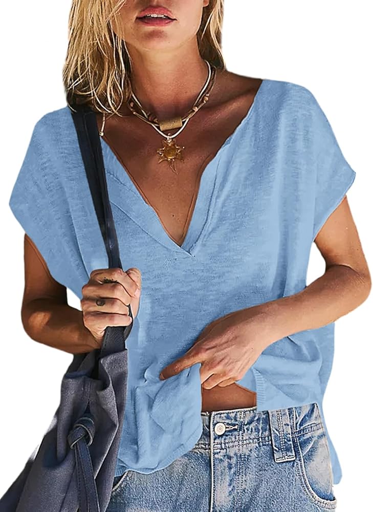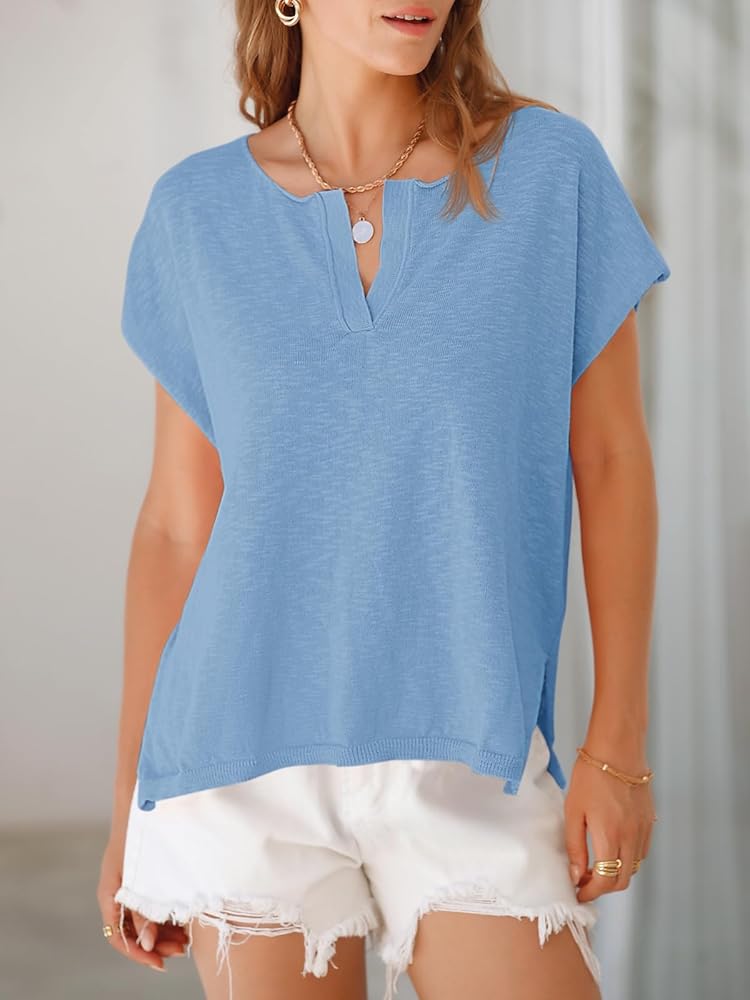 تصميم عصري - تتميز القمصان النسائية الأساسية الفضفاضة بأكمام قصيرة، ورقبة على شكل حرف V عميقة، ولون كلاسيكي ثابت، وحاشية مقسمة بفتحات تهوية ومواد محبوكة.