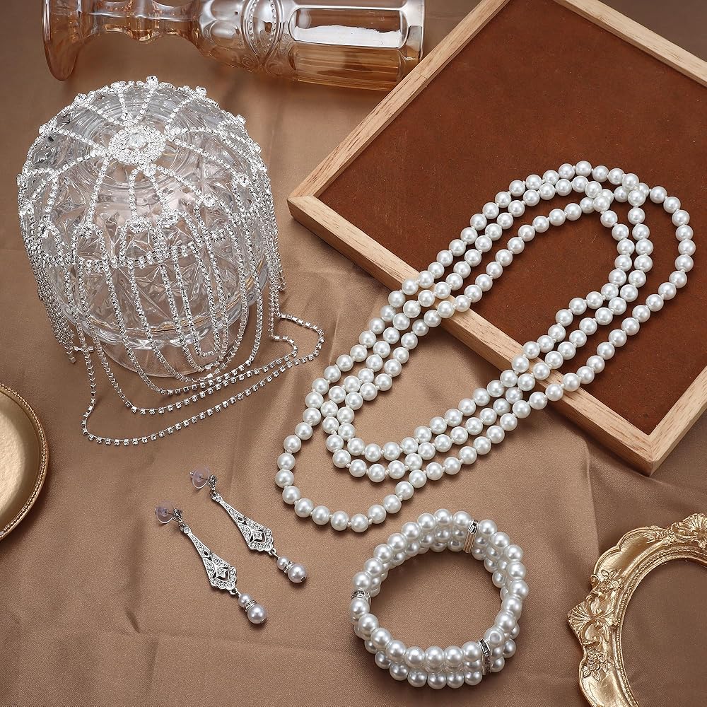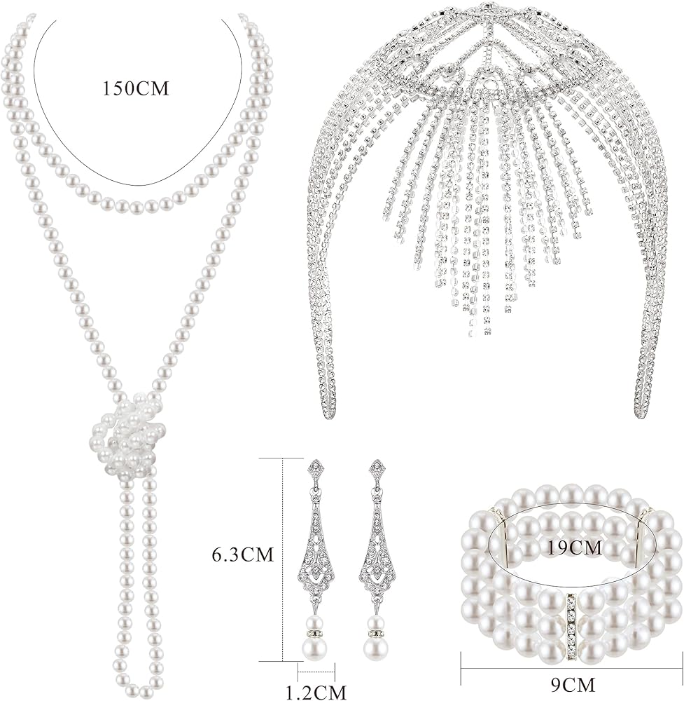 • إكسسوارات فلابر: مجموعة إكسسوارات 1920 تتضمن قطعة واحدة من غطاء الرأس المتلألئ 1920، وقطعة واحدة من عقد اللؤلؤ المقلد، وزوج واحد من الأقراط المتدلية من حجر الراين العتيق وقطعة واحدة من سوار اللؤلؤ متعدد الطبقات، وإكسسوارات فلابر فضية مثالية للنساء.