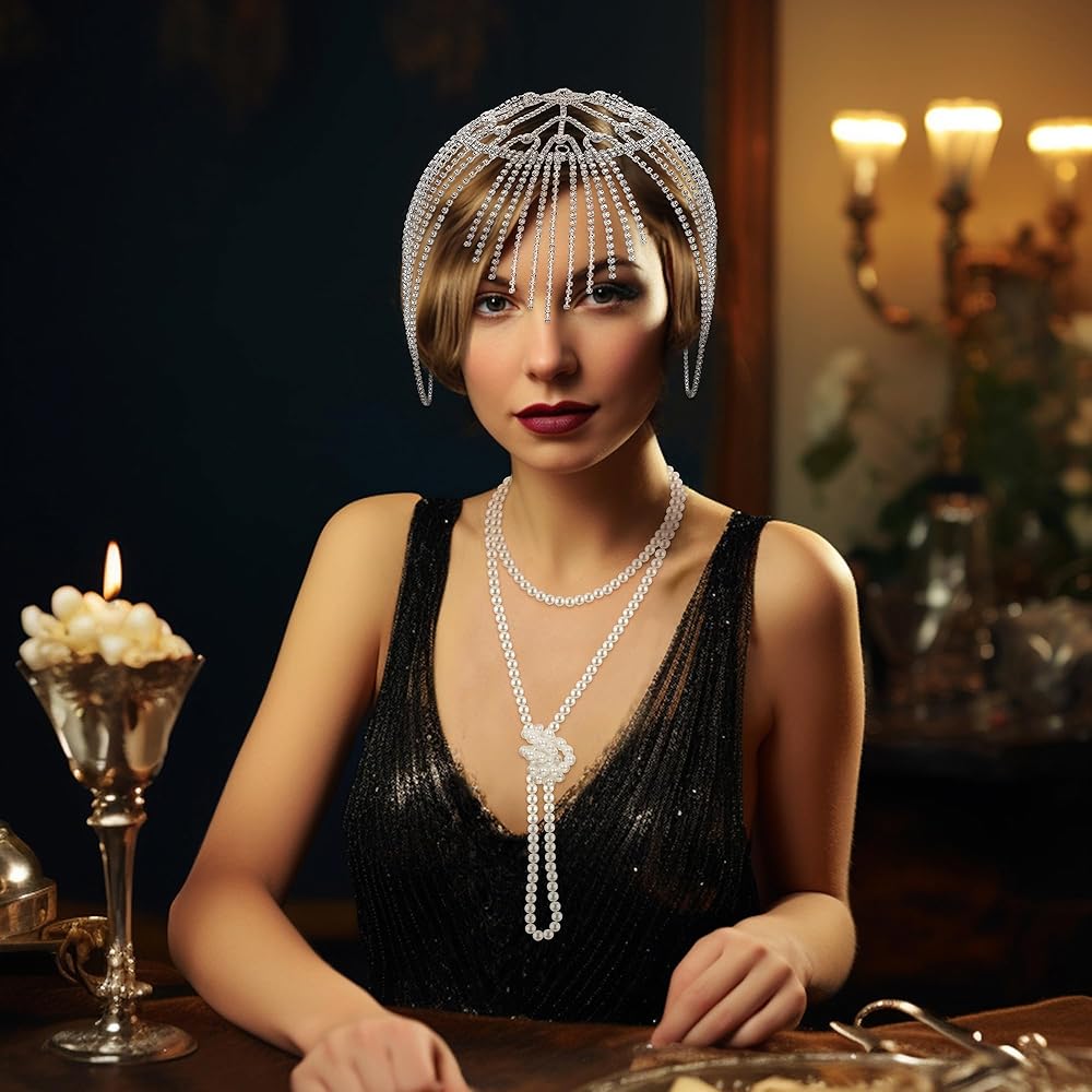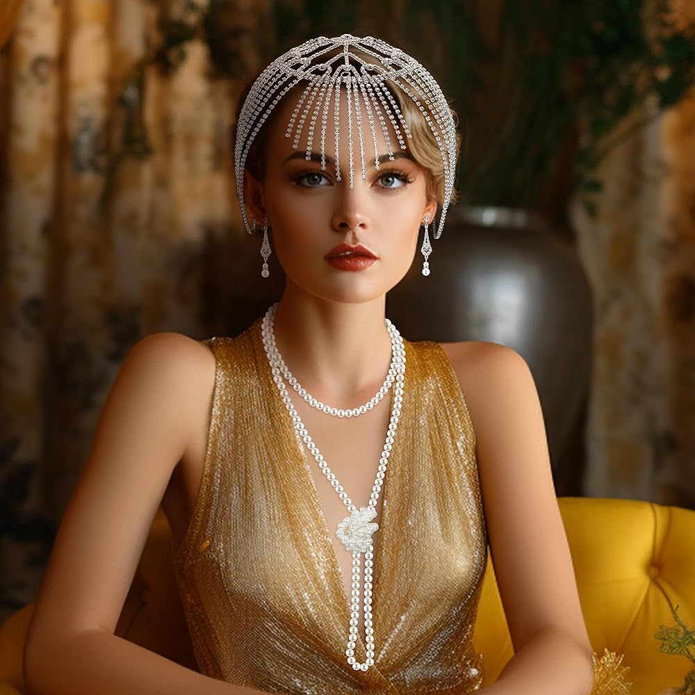 Sanfenly Great Gatsby إكسسوارات للنساء إكسسوارات فلابر مجموعة مجوهرات اللؤلؤ من العشرينيات من القرن الماضي الذهب والفضة خمر الزفاف حجر الراين خوذة طويلة فو اللؤلؤ قلادة سوار أقراط لحفل زفاف الهالوين تحت عنوان