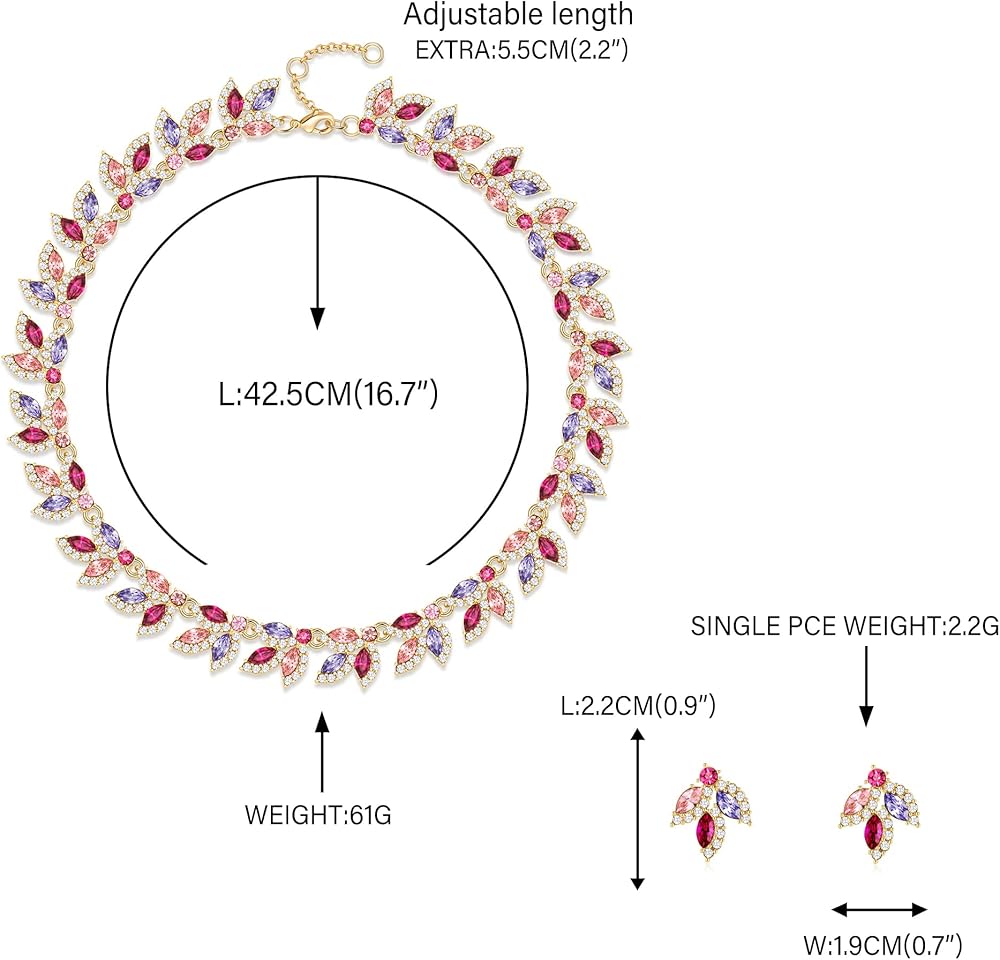 الحجم المناسب لمجموعة مجوهرات الزفاف: تتكون مجموعة مجوهرات الزفاف هذه من قلادة مقاس 17+2 بوصة وأقراط مسمار مقاس 1.8 × 2.2 سم، ويبلغ الوزن الصافي الإجمالي لها 2.23 أونصة، وهو مريح للارتداء لفترة طويلة.