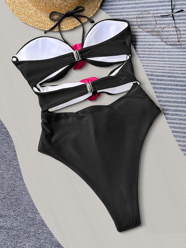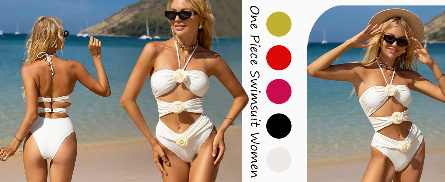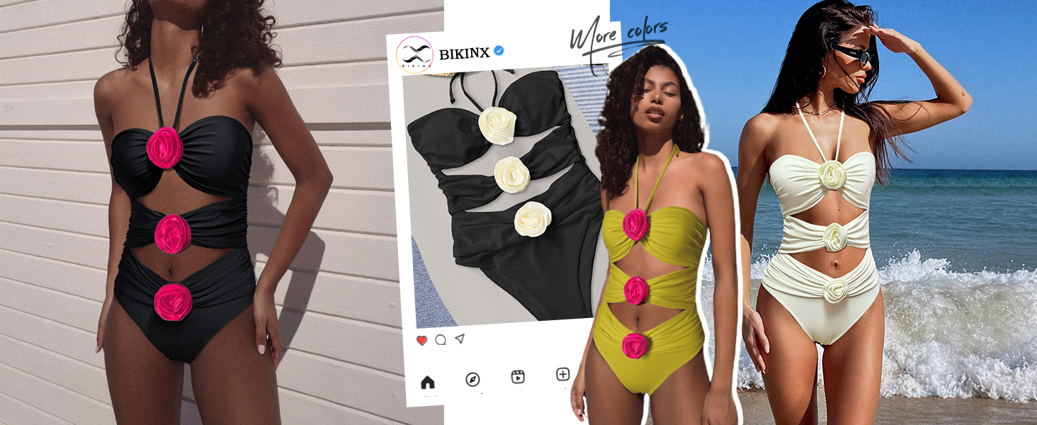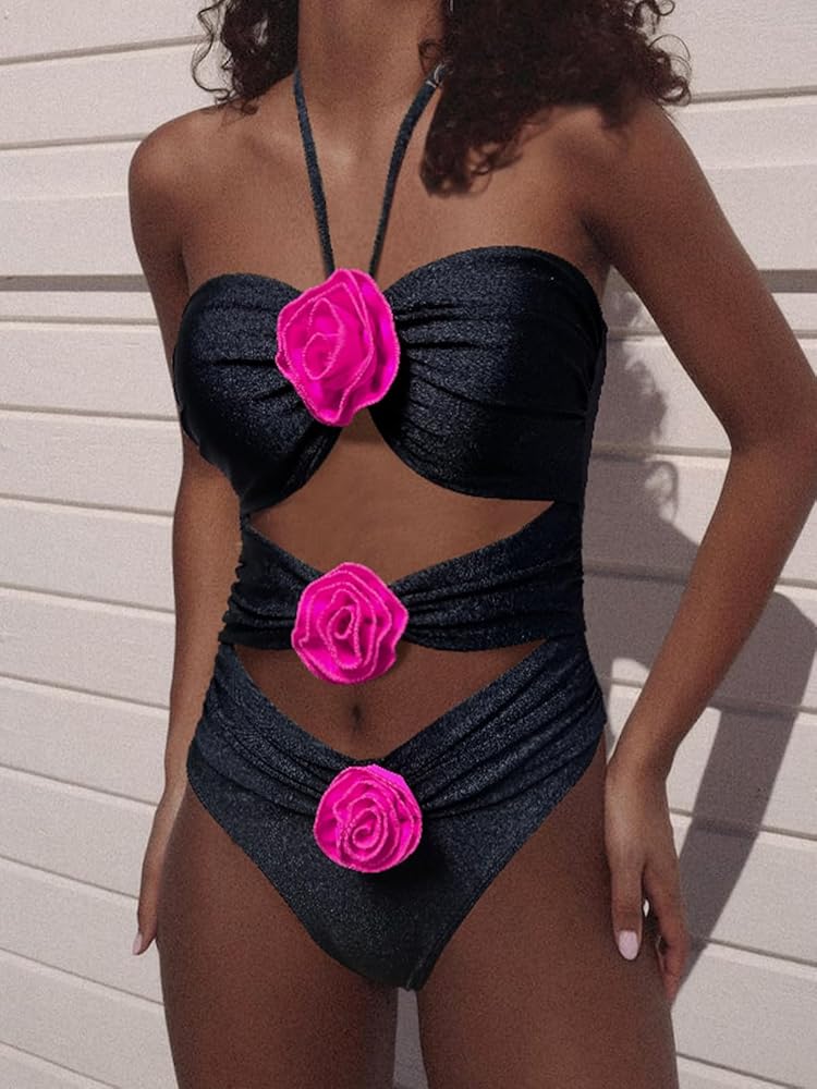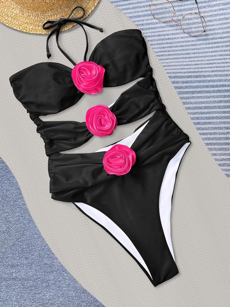 بدلة استحمام ثلاثية الأبعاد على شكل زهرة - تضيف الزهور الثلاثة ثلاثية الأبعاد في المنتصف لمسة من الغرابة والأنوثة، مما يخلق نقطة محورية مذهلة بصريًا. قمصان ملابس السباحة مع حزام الرسن تخلق صورة ظلية أنيقة تضيف لمسة من الجاذبية المرحة.