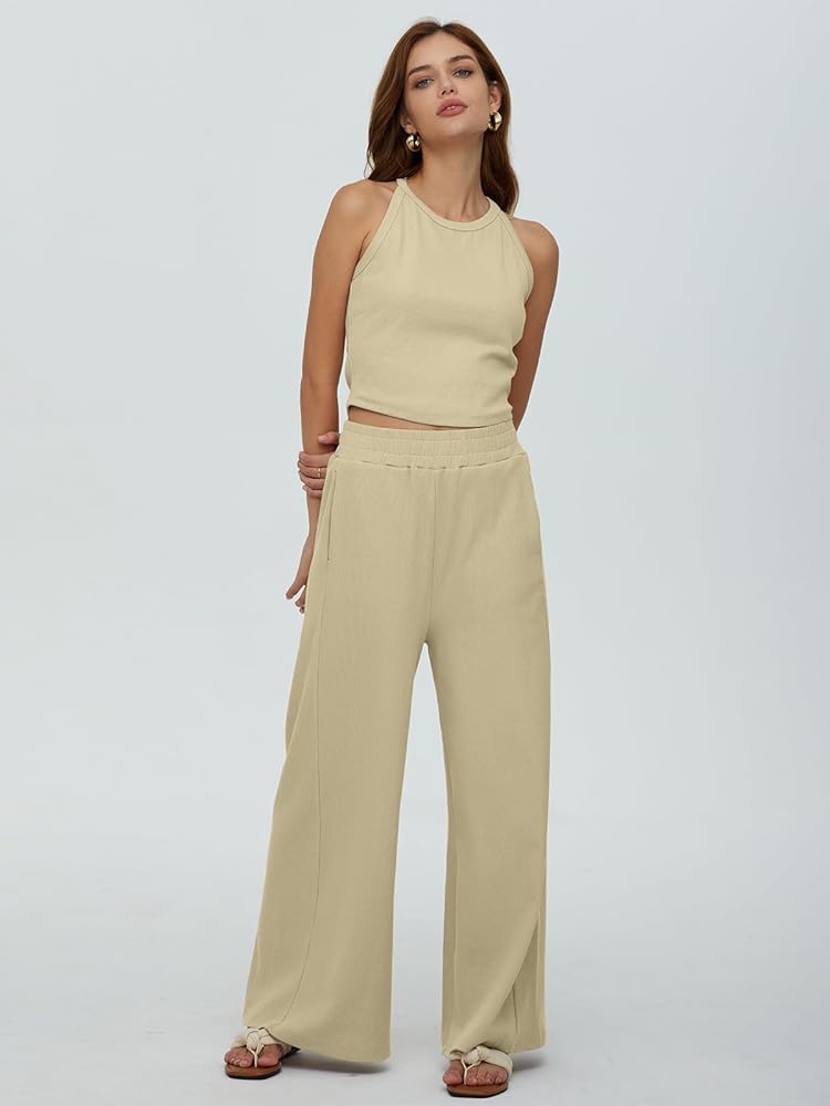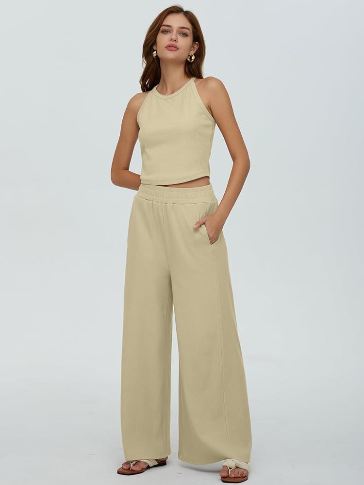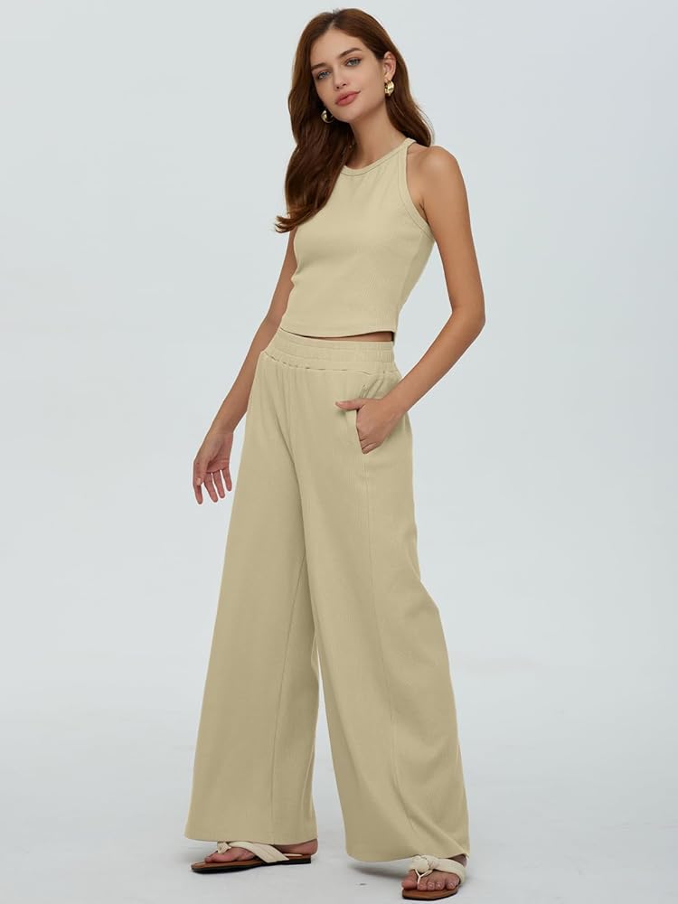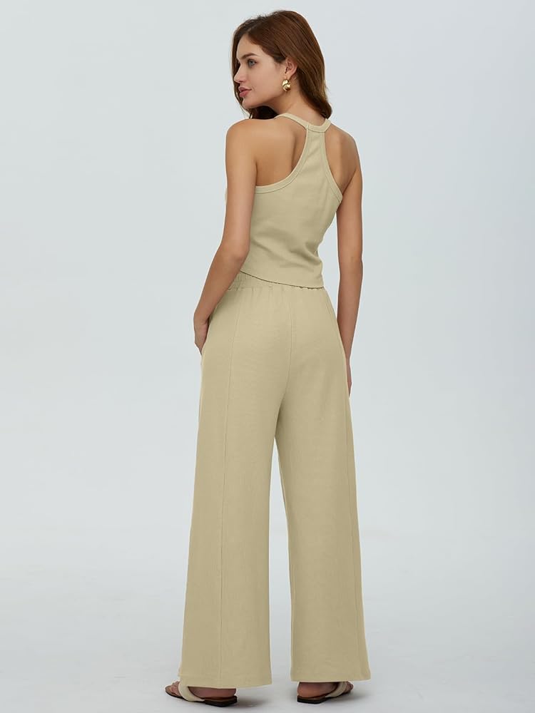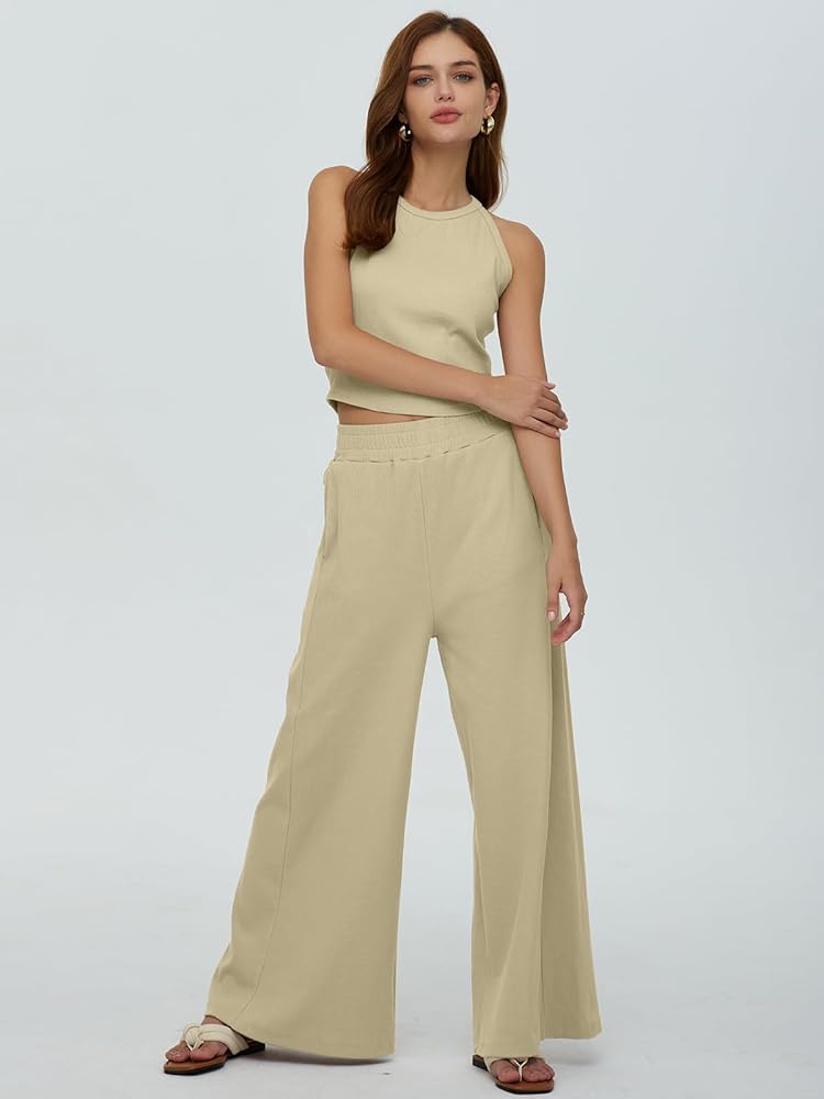 [أبرز مميزات التصميم] تتميز مجموعة الملابس هذه بقميص كلاسيكي بدون أكمام مع تصميم أنيق نحيف. بنطال بأرجل واسعة مع حزام خصر مرن ناعم يناسب أي حجم جسم، وجيبين على كلا الجانبين لوضع الهواتف المحمولة والوجبات الخفيفة الصغيرة.