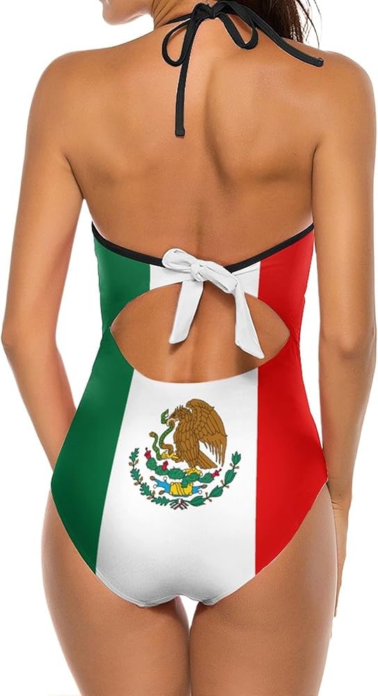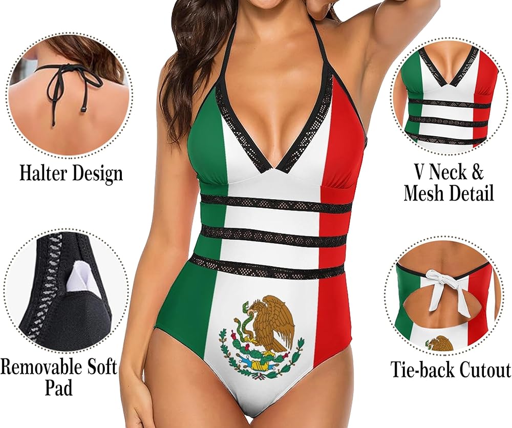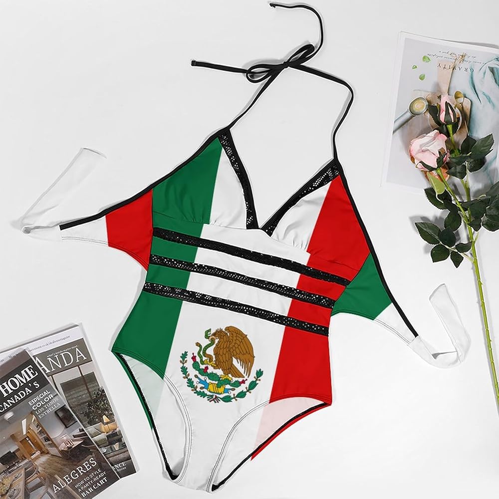 تصميم لافت للنظر: الدمج الفريد لعناصر العلم المكسيكي في نمط ملابس السباحة يخلق مظهرًا جذابًا ووطنيًا، مثالي لعرض حبك للمكسيك.