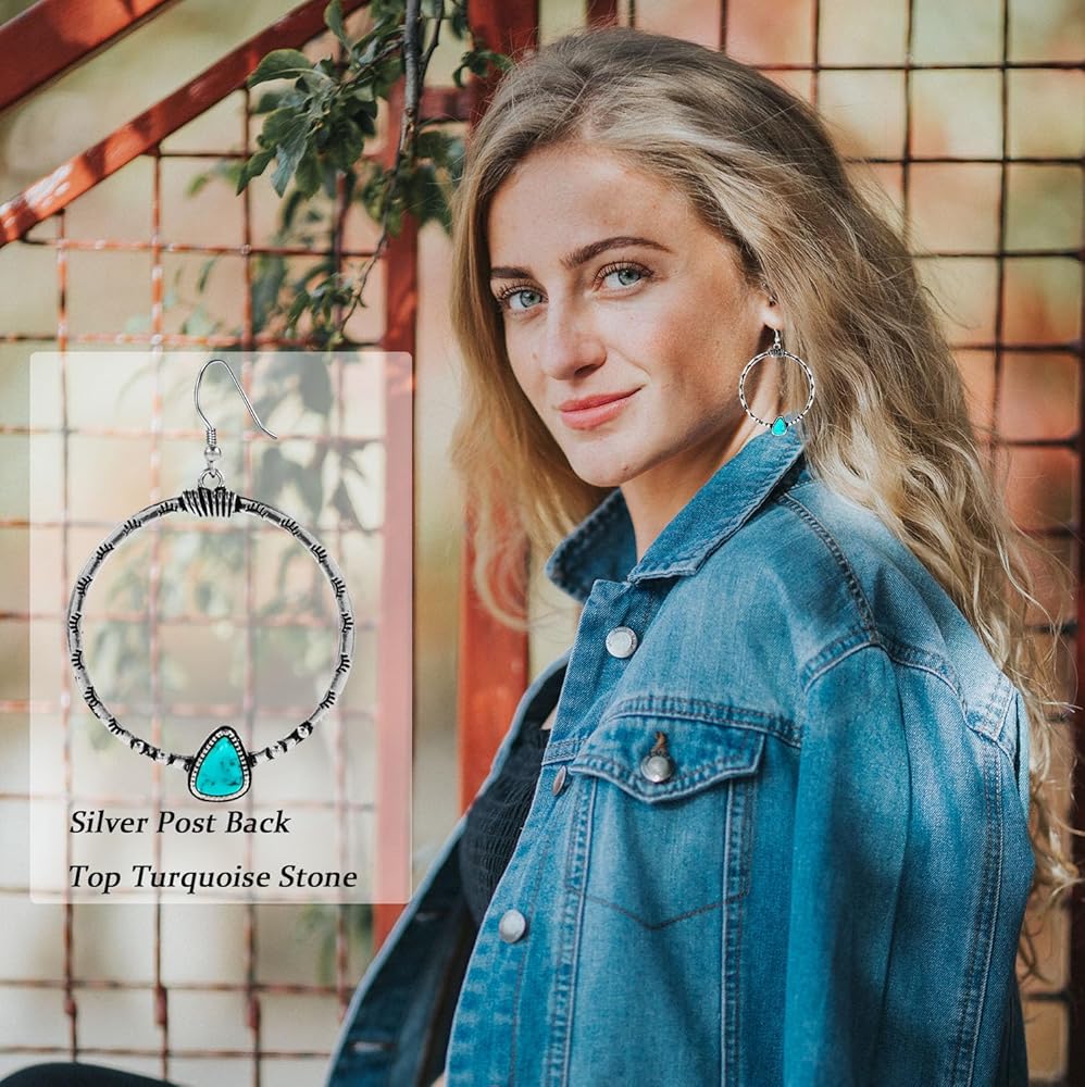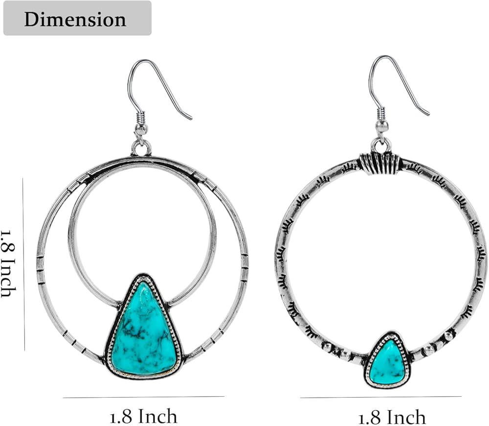 • 【زوجان من الأقراط الغربية للنساء】: يوجد زوجان من الأقراط الفيروزية الغربية للنساء في العبوة. قطر الأقراط الحلقية الفيروزية 4.5 سم (1.8 انش). إنها كبيرة وتشكل أقراط رائعة للحفلات الراقصة أو الارتداء اليومي.
