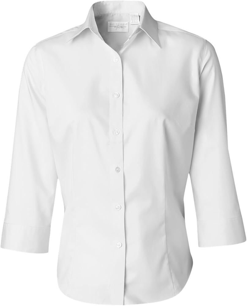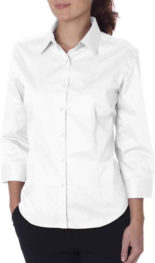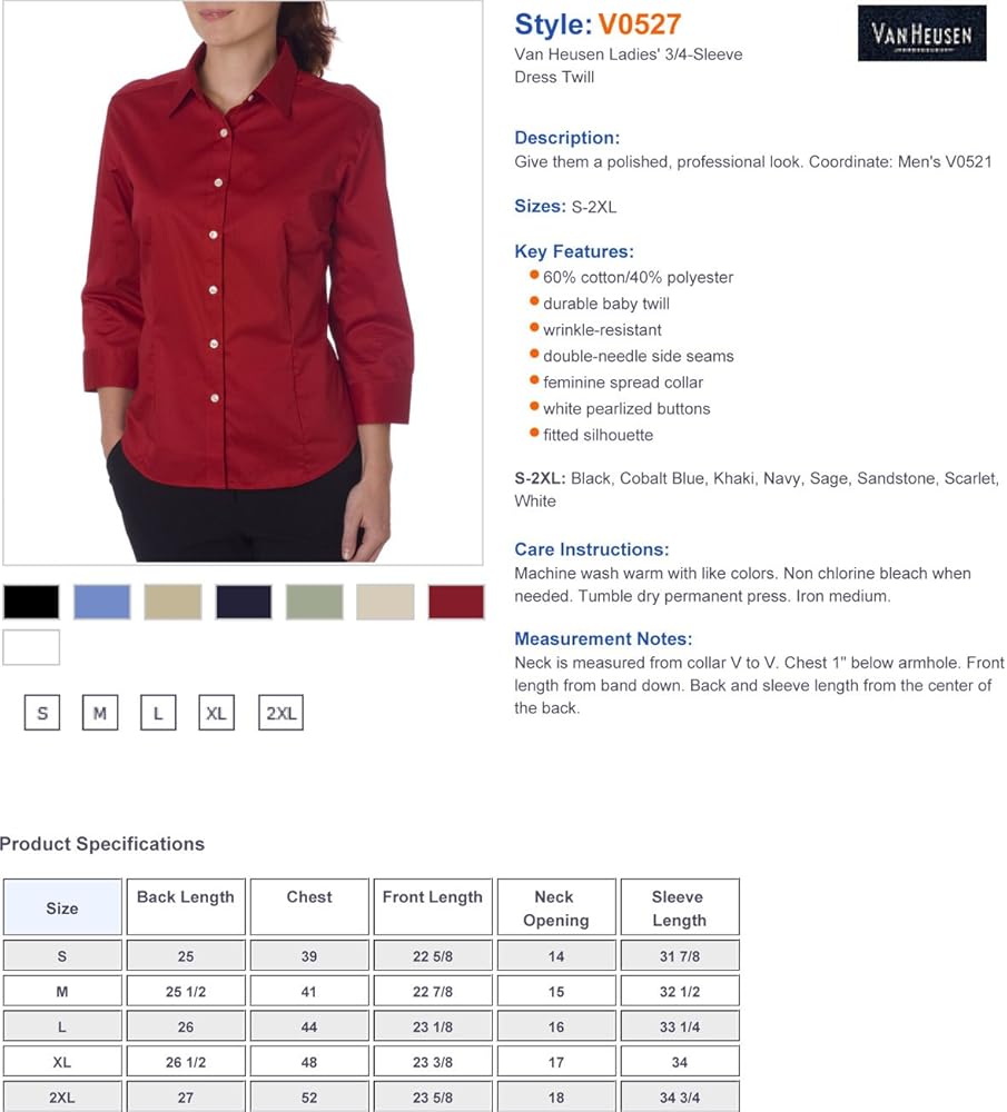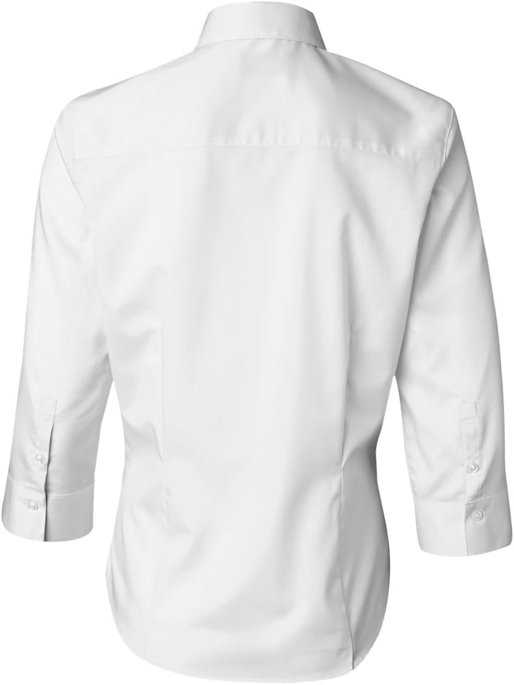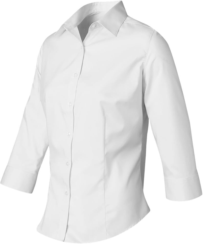 3.35 oz.; 60% cotton/40% polyester three-quarter sleeve dress twillWrinkle-resistant twill fabricFeminine fitPoint collarNarrow placket with pearlized buttonsTwo button adjustable cuffs with button through sleeve placketDouble-needle felled side seams.Available Sizes: S; M; L; XL; 2XL
