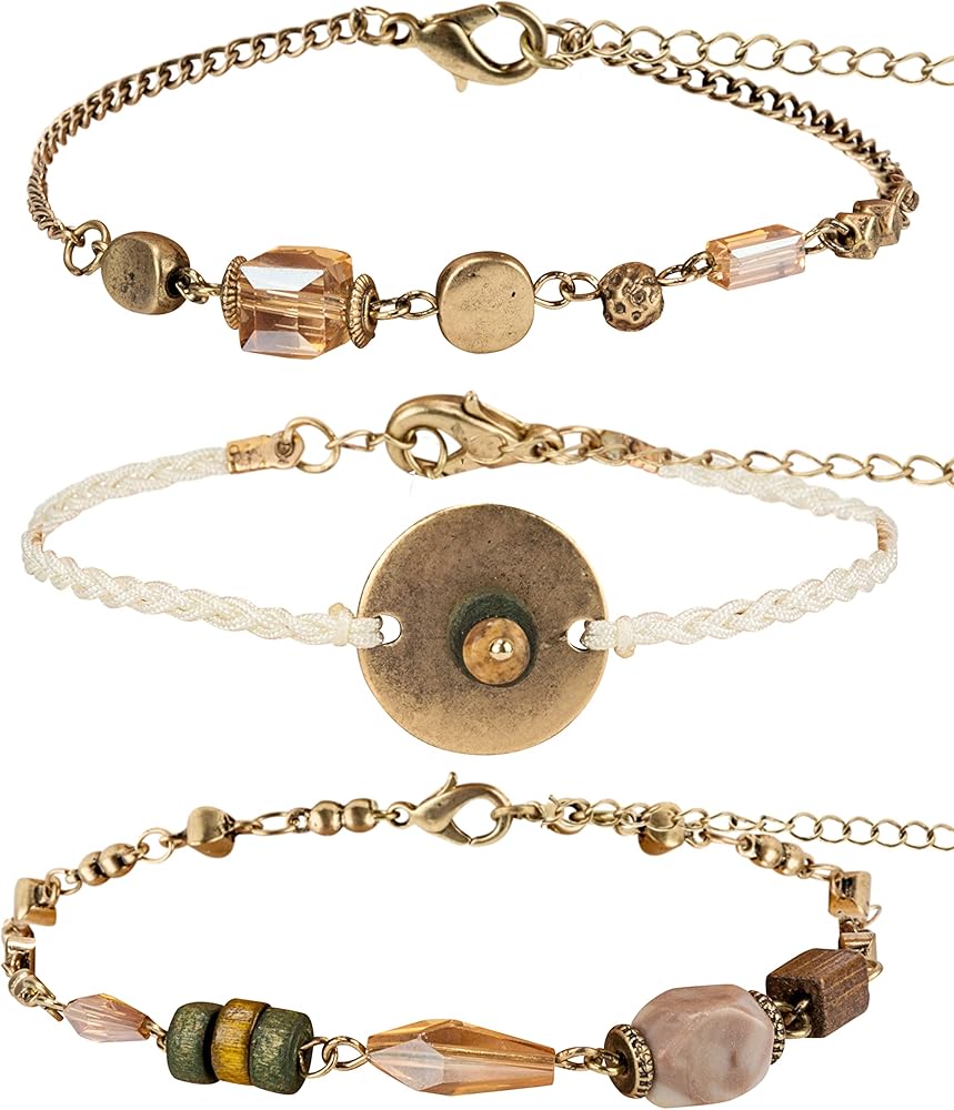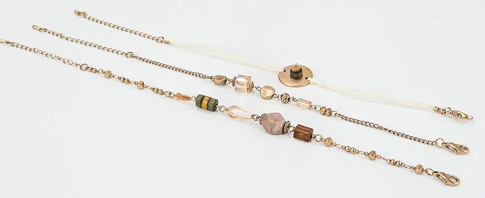 يتميز سوار بوهو المكون من 3 قطع بسلسلة ذهبية عتيقة وحبل مضفر مع زجاج مربع ومستطيل لامع وخرز خشبي باللون البني والأخضر مع لمسات ذهبية عتيقة.