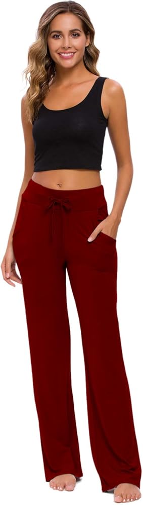 سروال يوجا للنساء مع جيوب بساق مستقيمة فضفاضة مريحة مودال برباط سحب للركض، سروال رياضي كاجوال طويل نشط