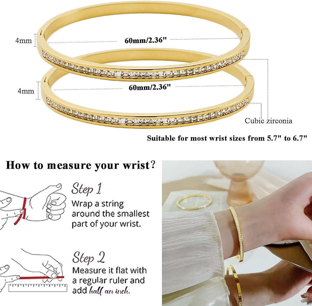 سوار زركونيا مكعب: يبلغ محيط السوار 18 سم (7 بوصات) وعرضه 6 ملم. يبلغ قطره الداخلي حوالي 6 سم × 5 سم (2.36 بوصة × 1.97 بوصة)، مما يجعله مناسبًا لمعظم مقاسات المعصم التي تتراوح من 5.7 بوصة "إلى 6.7".