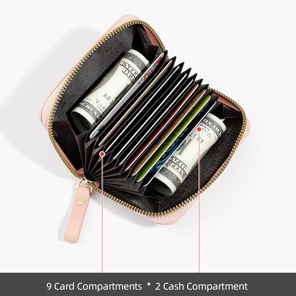 - محفظة أكورديون صغيرة بتصميم بسحاب حولها، فهي آمنة وتحمي بطاقاتك ونقودك والعملات المعدنية من الخسارة.