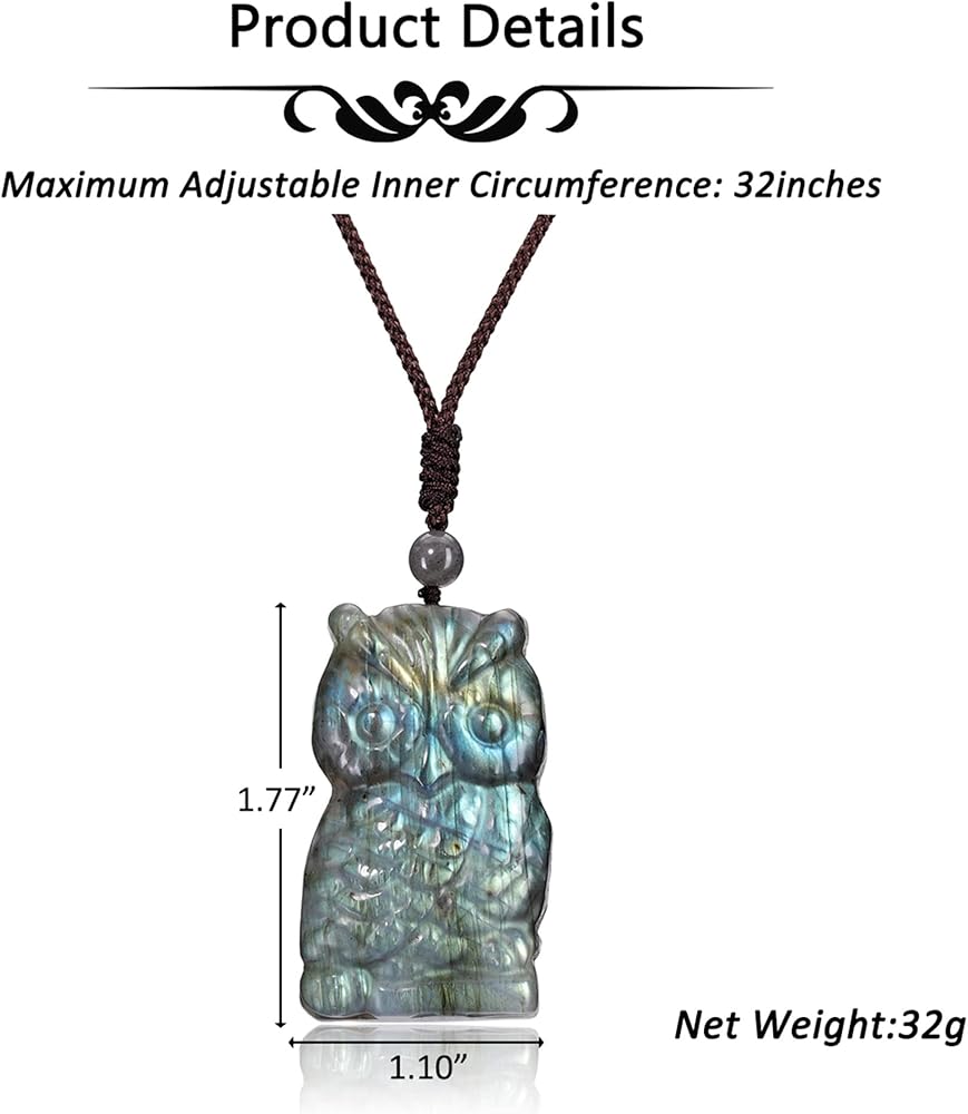 [المواصفات]: قلادة البومة: 1.75 × 1.18 بوصة، طول السلسلة (الحد الأقصى): 32 بوصة، مقاس قابل للتعديل، مناسبة لكل من الرجال أو النساء؛ المادة: كريستال لابرادوريت طبيعي؛ الوزن: 32 غرام؛ العبوة: 1 × قلادة كريستال لابرادوريت