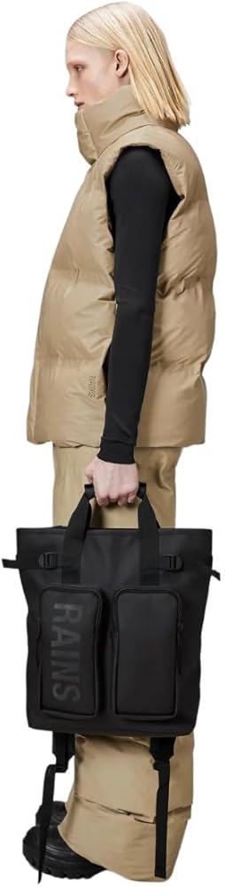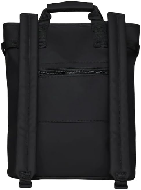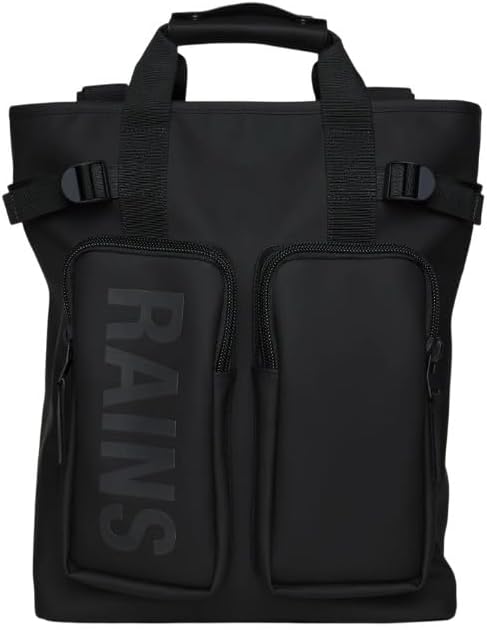 RAINS Black backpack with front pockets with logo. Zip closure, back pocket with zip and inside there are two compartments. Equipped with two handles. Autumn Winter Collection