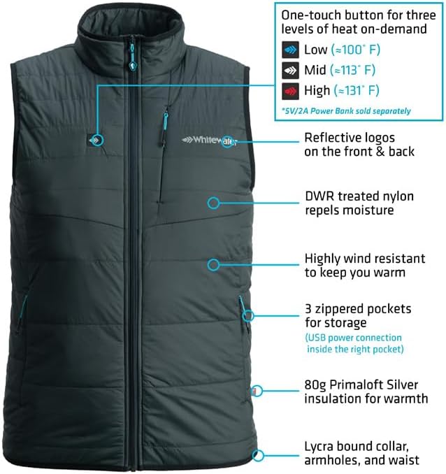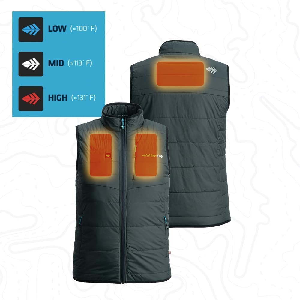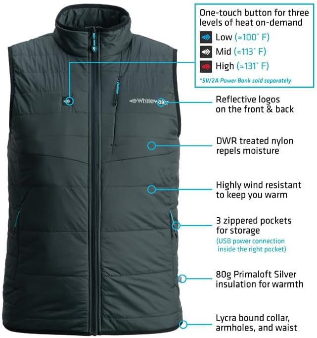 • الدفء عند الطلب: تتميز سترة الصيد ذات عزم الدوران المدفأة من Whitewater بزر بلمسة واحدة يوفر ثلاثة مستويات من الحرارة عند الطلب عبر كابل طاقة USB مدمج في جيب سترة Torque Insulted Heated (يتطلب بنك طاقة 5 فولت/2 أمبير و تباع منفصلة). تسمح وسادتان للتدفئة على الصدر وواحدة في الجزء العلوي من الظهر بتعديل درجة الحرارة من منخفضة (≈100 درجة فهرنهايت) إلى متوسطة (≈113 درجة فهرنهايت) إلى عالية (≈131 درجة فهرنهايت) للحصول على دفء مثالي في أي سيناريو.