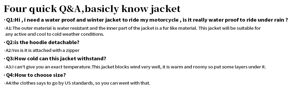 مقاومة للرياح: ① أساور أكمام قابلة للتعديل، قفاز مطاطي مع فتحة إبهام يساعد على الحفاظ على الدفء. ② تنورة داخلية مقاومة للرياح، حاشية برباط داخلي، قلنسوة عاصفة قابلة للفصل والتعديل تساعد على منع الرياح. ③ غلاف ناعم مقاوم للاهتراء ومقاوم للرياح بشكل كبير.