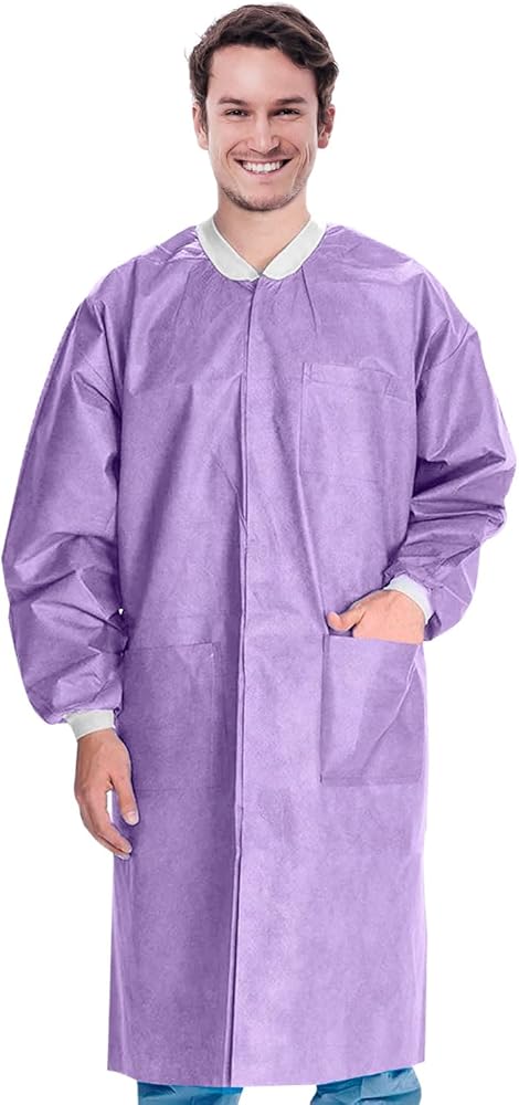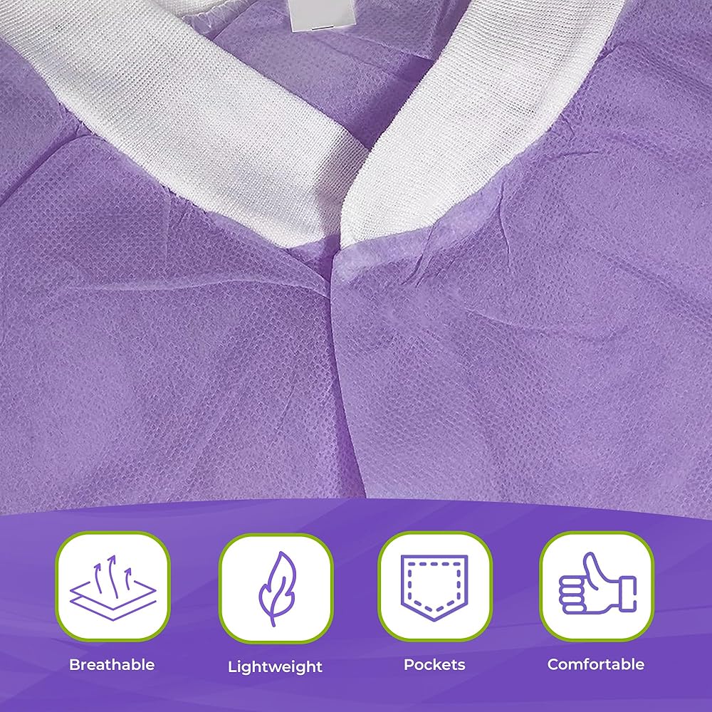 معطف مختبر AMZ للاستعمال مرة واحدة، مقاس XX-Large. عبوة مكونة من 10 معاطف مختبر أرجوانية للاستعمال مرة واحدة للبالغين. معطف مختبر 45 جي إس إم للاستعمال مرة واحدة. معاطف طبية للاستعمال مرة واحدة مزودة بخطاف وحلقة تثبيت، وجيوب، وأساور أكمام محبوكة، وياقة