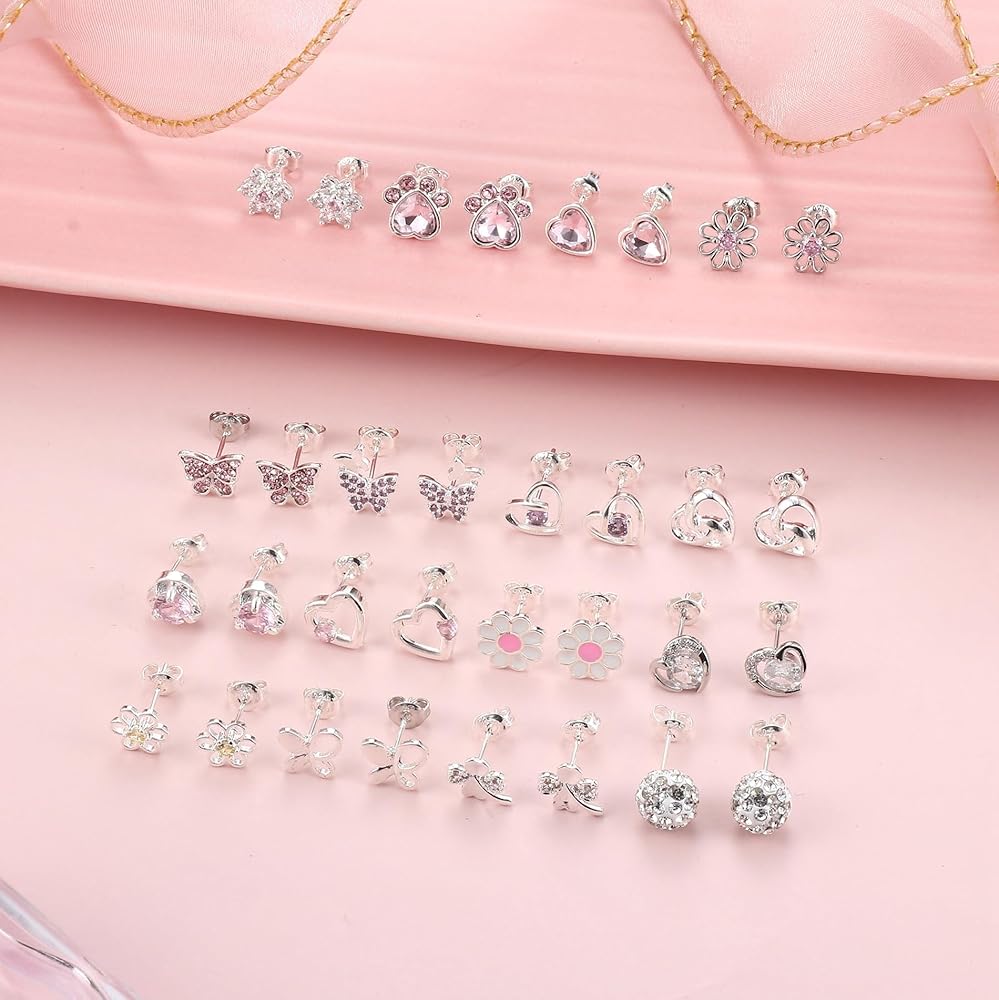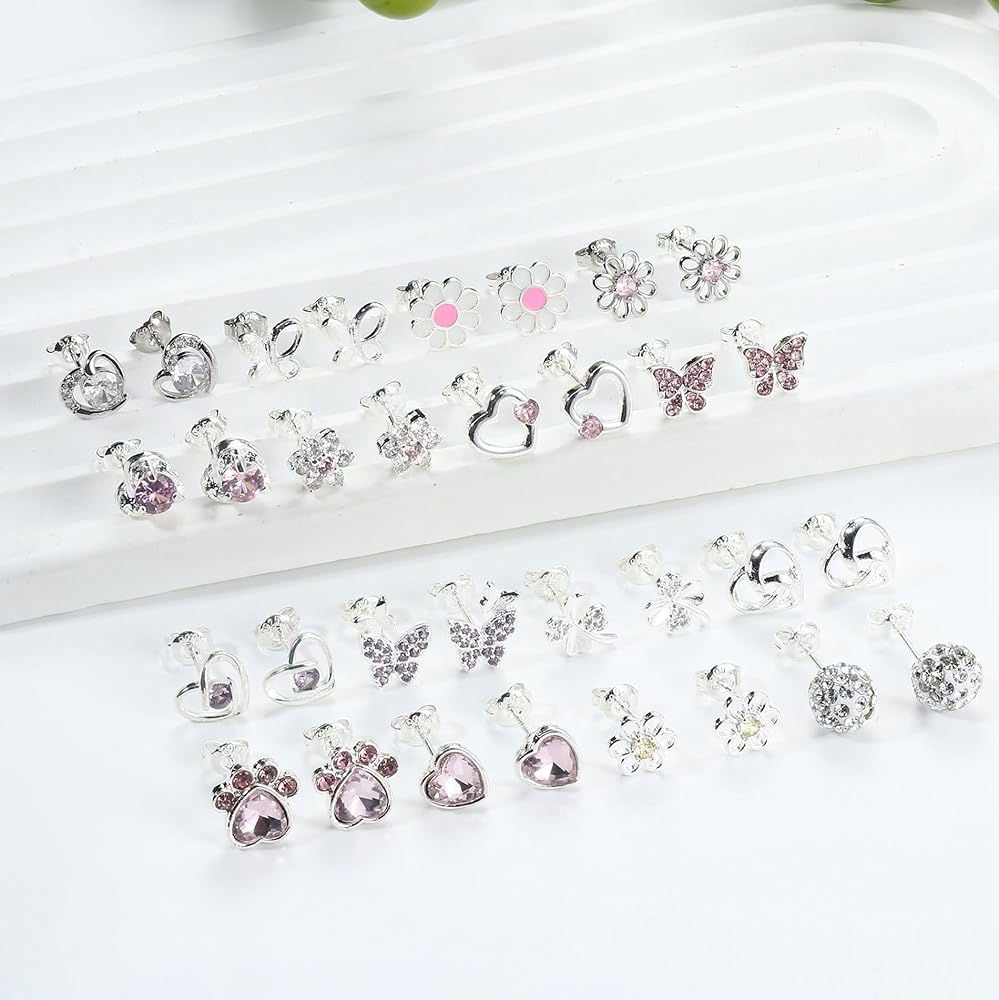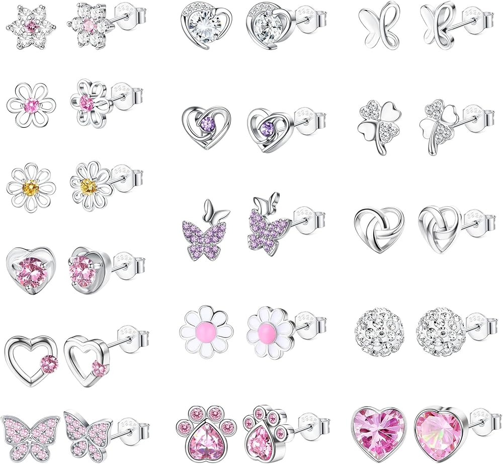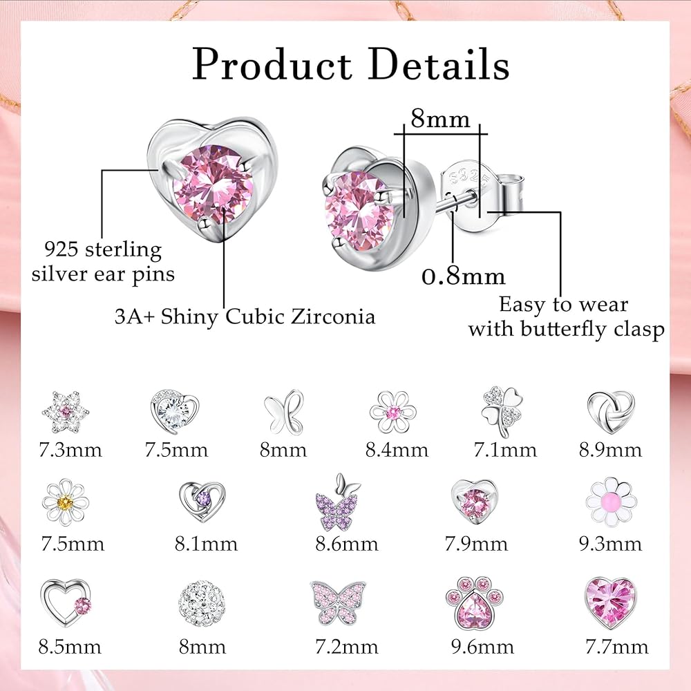 🌸Silver Stud Earrings For Girls:There are 6/8/12/16 pairs of silver earrings in different styles, including heart earrings, cubic zirconia earrings,butterfly earrings, flower studs and cute daisy studs, etc.There is a large number of styles to meet your daily matching needs.The pink and purple zirconia studs have a sparkling look that You and your daughter will love it and are perfect for everyday wear.