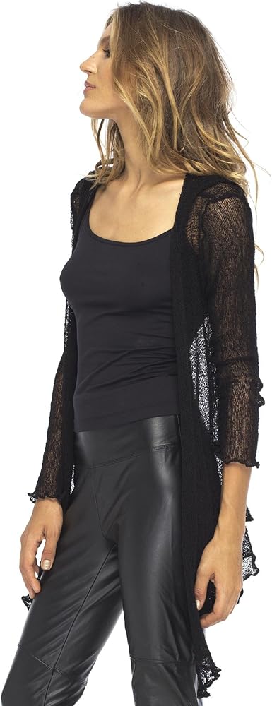 سترة سوداء طويلة بغطاء للرأس خفيفة الوزن تتميز بمطاط ناعم ومريح وثنية انسيابية. تبدو هذه السترة متعددة الاستخدامات مفتوحة من الأمام رائعة مع الجينز أو السراويل الضيقة أو السراويل أو التنورة أو الفستان بدون أكمام