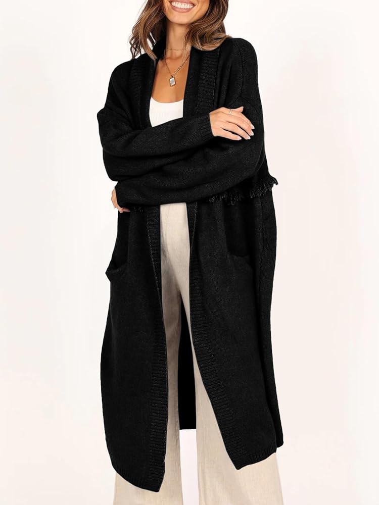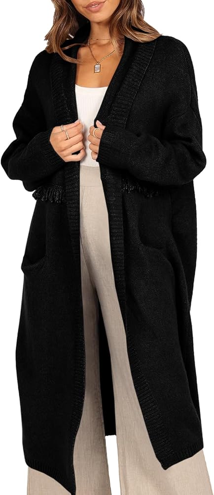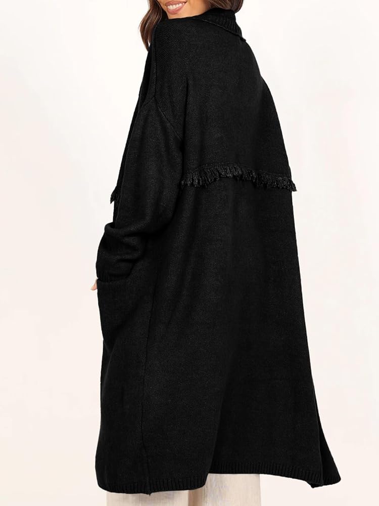 Features: long sleeve Fringe casual slouchy sweater cardigan, oversized knit, solid color, tassels, with pockets, long fall and winter knitted casual fashion women's cardigan, solid color women's cardigan, available in a variety of color options and sizes.