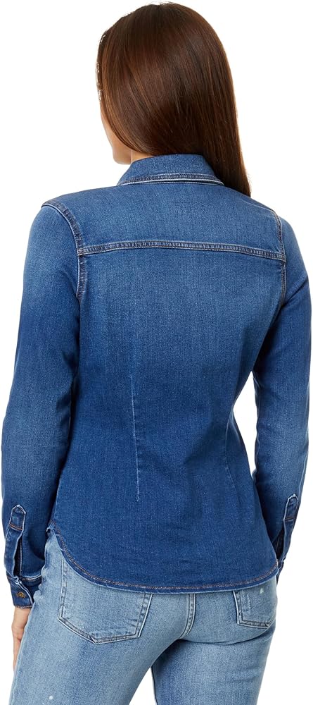 Featuring a classic silhouette, the KUT from the Kloth Romy Shirt Pocket Flap Jacket adds style to your look. The stretch-denim jacket has a folded collar with a button-up front closure, long sleeves with buttoned cuffs, and a curved hemline.
